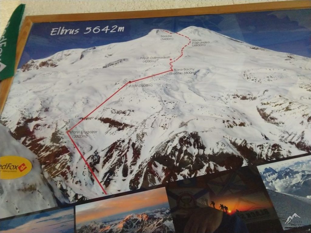 Caemos en la cuenta que son más de las doce y estamos en ayunas, decidimos almorzar a la hora de los “guiris”, entramos en un restaurante, la camarera es muy simpática, no habla inglés pero nos saca una carta ruso-inglés. El sitio es acogedor, con fotos por todas partes del Elbrus, y sale un alpinista con banderas en diferentes cumbres, será el dueño del bar…