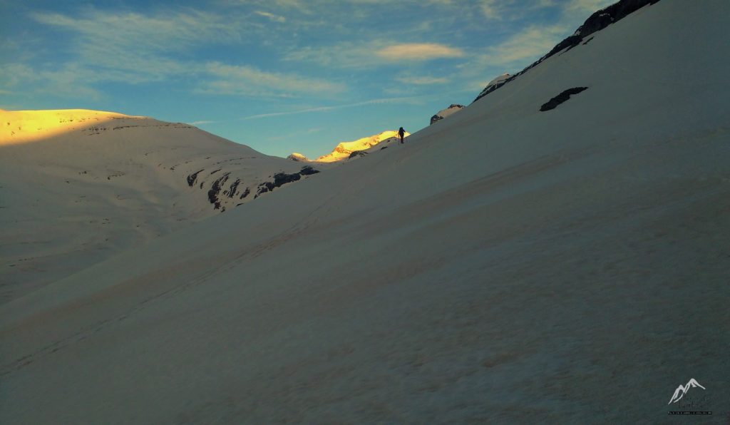 Habría que bajar y subir hacia la brecha que está a nuestra derecha, pero hemos decidido ir a media ladera para no perder altura, Bene se coloca delante y comienza a caminar por la empinada ladera de hielo, nuestros sentidos se agudizan, la caída es grande y el hielo es duro como la roca, vamos progresando en dirección a unas rocas que tendremos que salvar al final de la ladera…