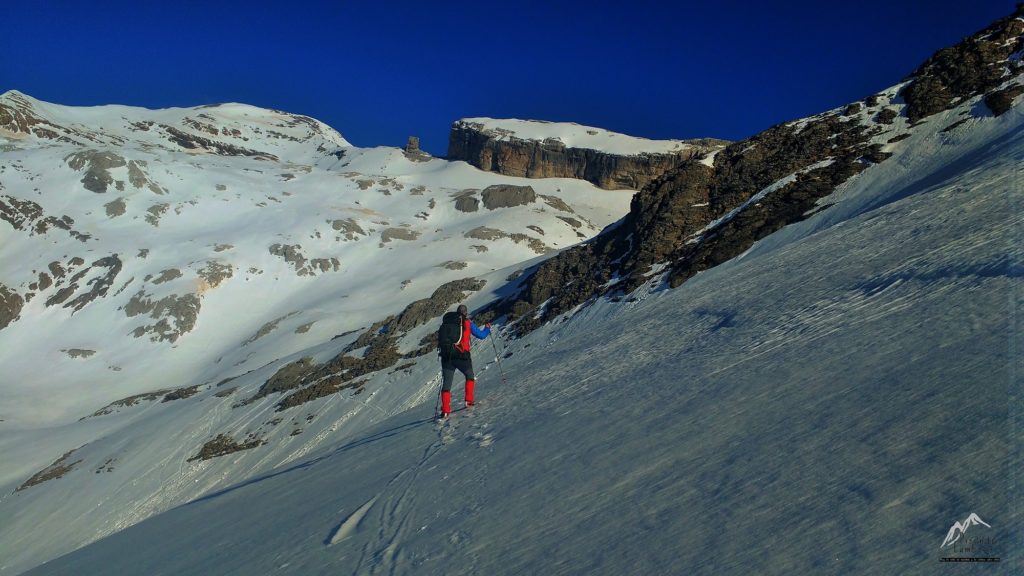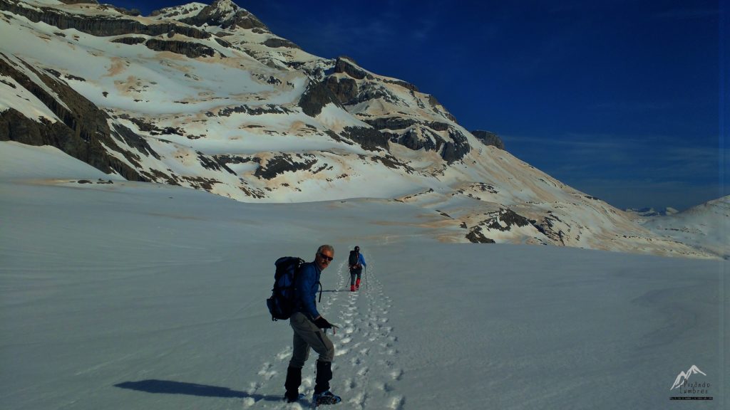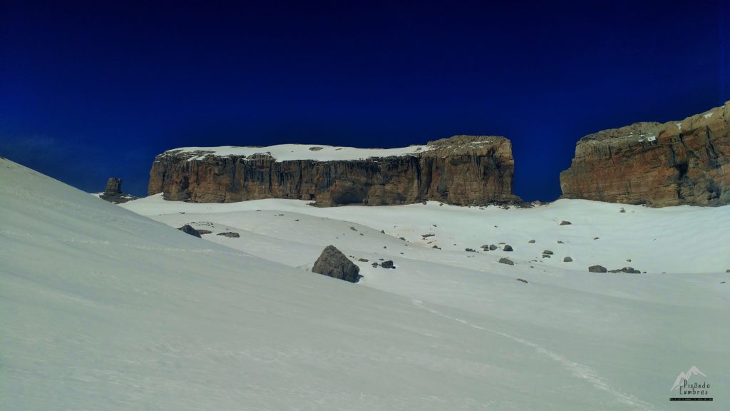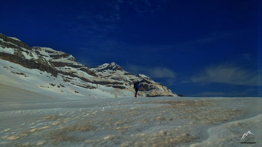 Pasamos por debajo de la cueva de hielo fósil de Casteret, está cubierta de nieve, bajamos un poco y nos asentamos en el fondo del valle, como nos recomendó Luis el guarda de Góriz, lejos ,muy lejos vemos a Ceci, el andador de nieves…, llegará muy pronto a la Brecha. Pero nosotros no iremos a ella, la nieve está estupenda y queremos un tres mil, ¡A eso vinimos…! , iremos al Taillon que nos tienta a nuestra izquierda…