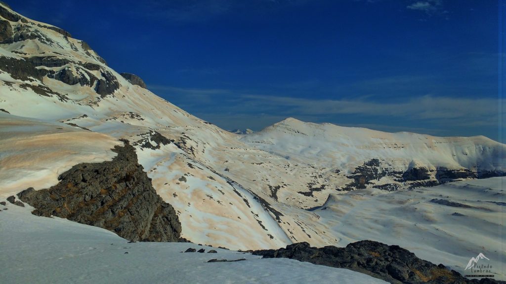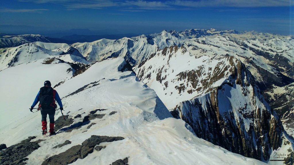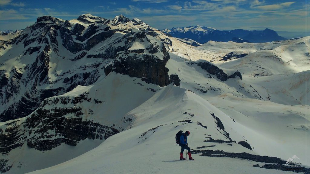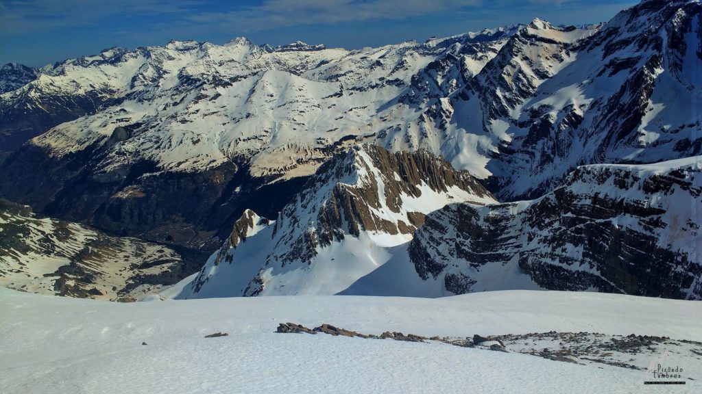 Las vistas al lado francés sobrecogen de picos nevados y cielos azulados…, tenemos un día perfecto, vamos progresando por la arista a medida que aparece ante nuestros ojos cada vez más picos y el circo de Gavarnie, con sus tres terrazas y sus cascadas de hielo, Bene está flipando de sus recuerdos de juventud en ese paraje…