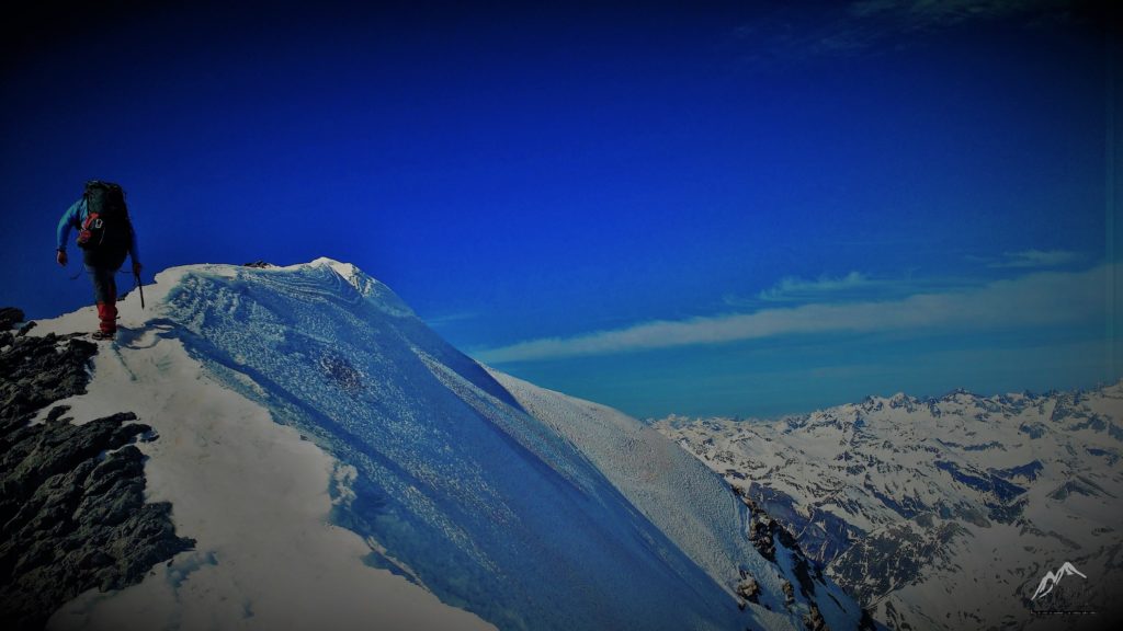 El paso del dedo en teoría es lo más delicado, pues se hace por el lado francés y un resbalón y acabas en el fondo del glaciar del Taillon, por fortuna esta zona está a la sombra, y habrá hielo con buen agarre, Bene se pone delante, tiene más experiencia alpina que yo…, aunque esta cornisa me la hice apenas hace unos meses.