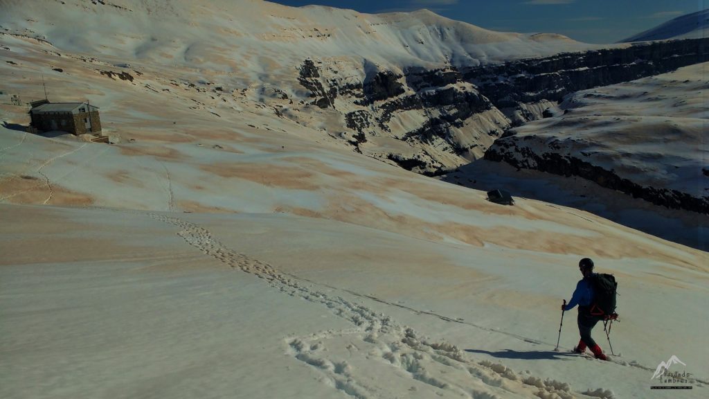 He salido tras Bene, que está en la zona de entrada al refugio, se revuelve inquieto mirando el camino de subida al Perdido, pisa la nieve que está dura, que nos esperaba, pero que no subiremos…, el sueño perdido del Perdido.