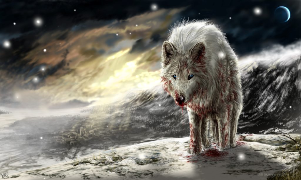 Trata de correr, es imposible, jadeante se queda doblado mirando cómo se le van a venir encima, pero en un último impulso de desesperación, se da la vuelta y empieza a correr, pero a los pocos metros delante suya aparece un perro, no, no es un perro, es un lobo blanco con los ojos azul hielo…, el hombre comprende que no tiene escapatoria, se hinca de rodillas, tira el cayado, y se queda esperando la muerte terrible que se le avecina…