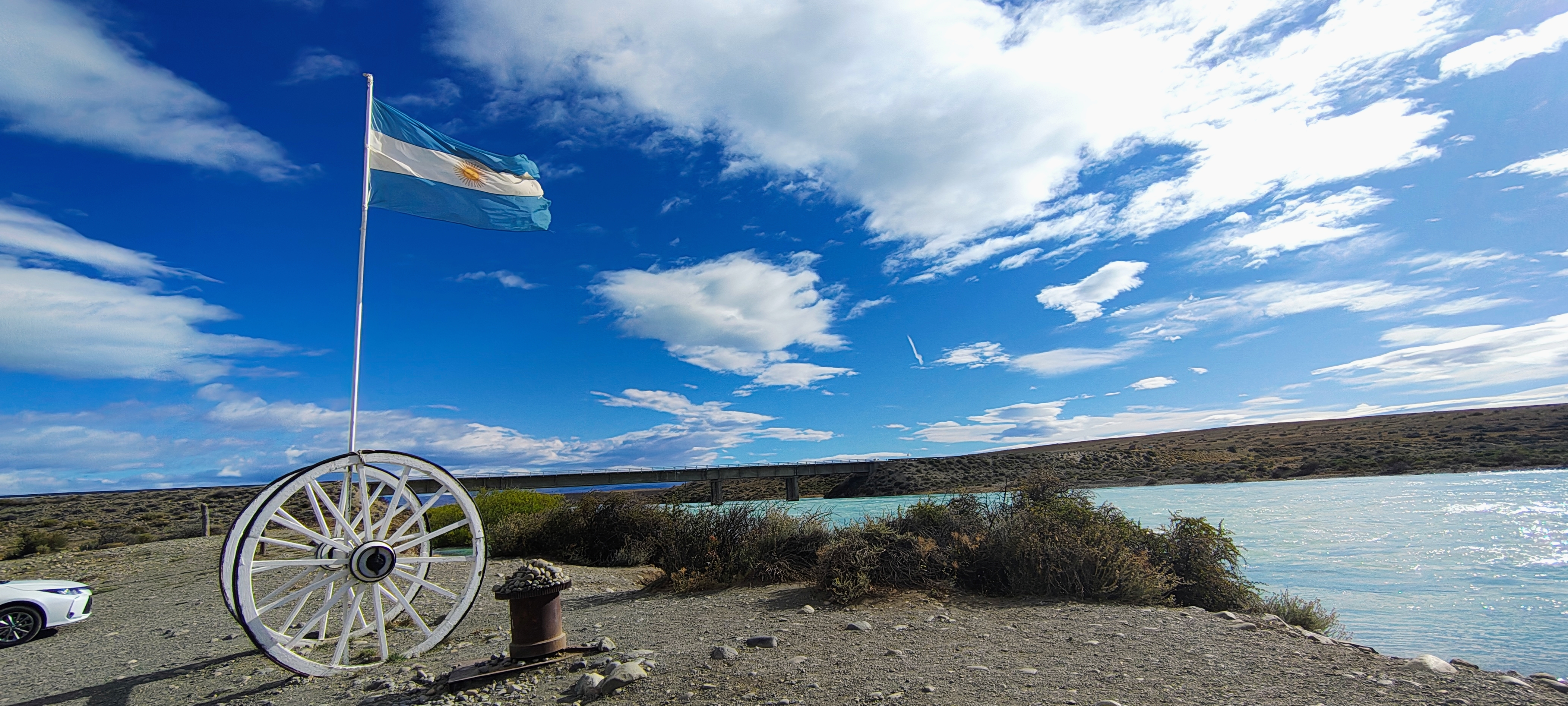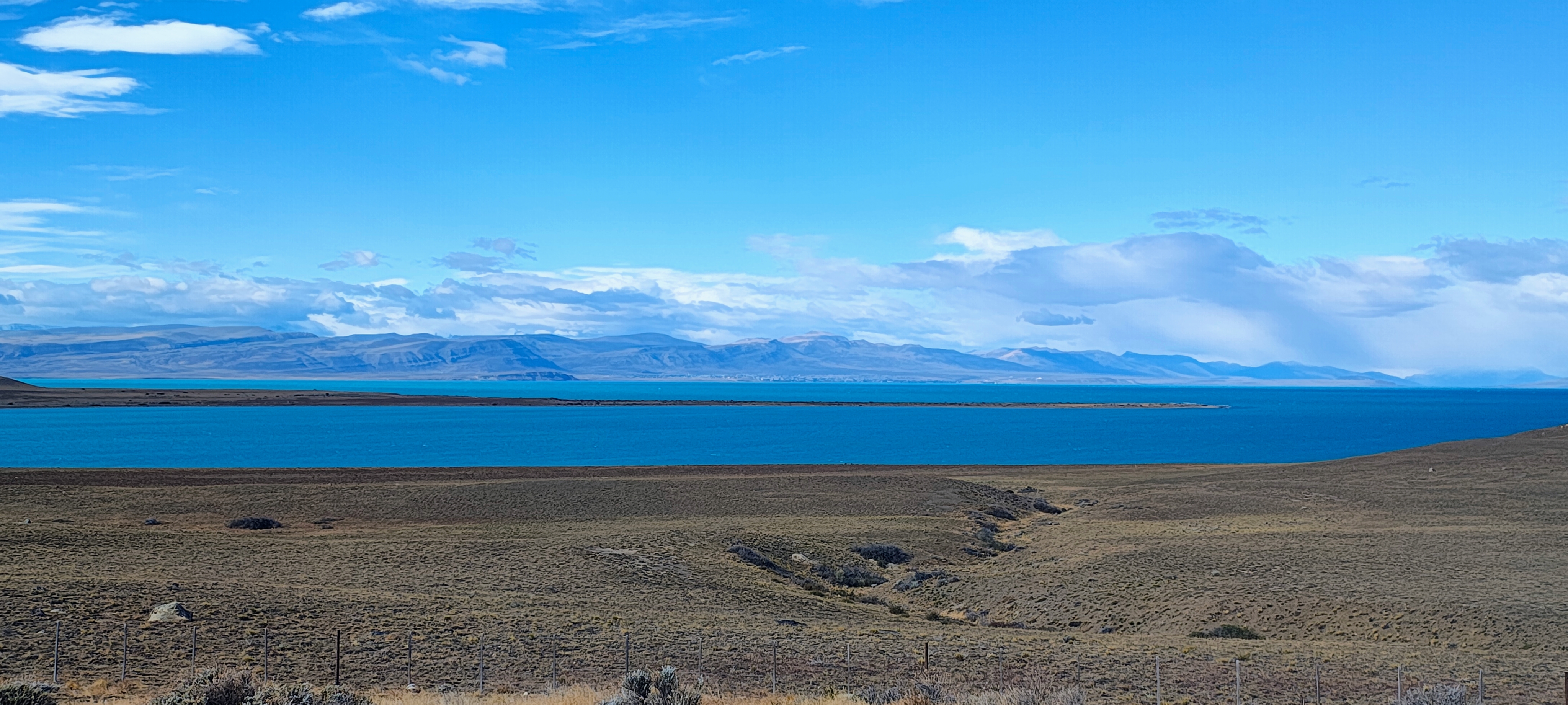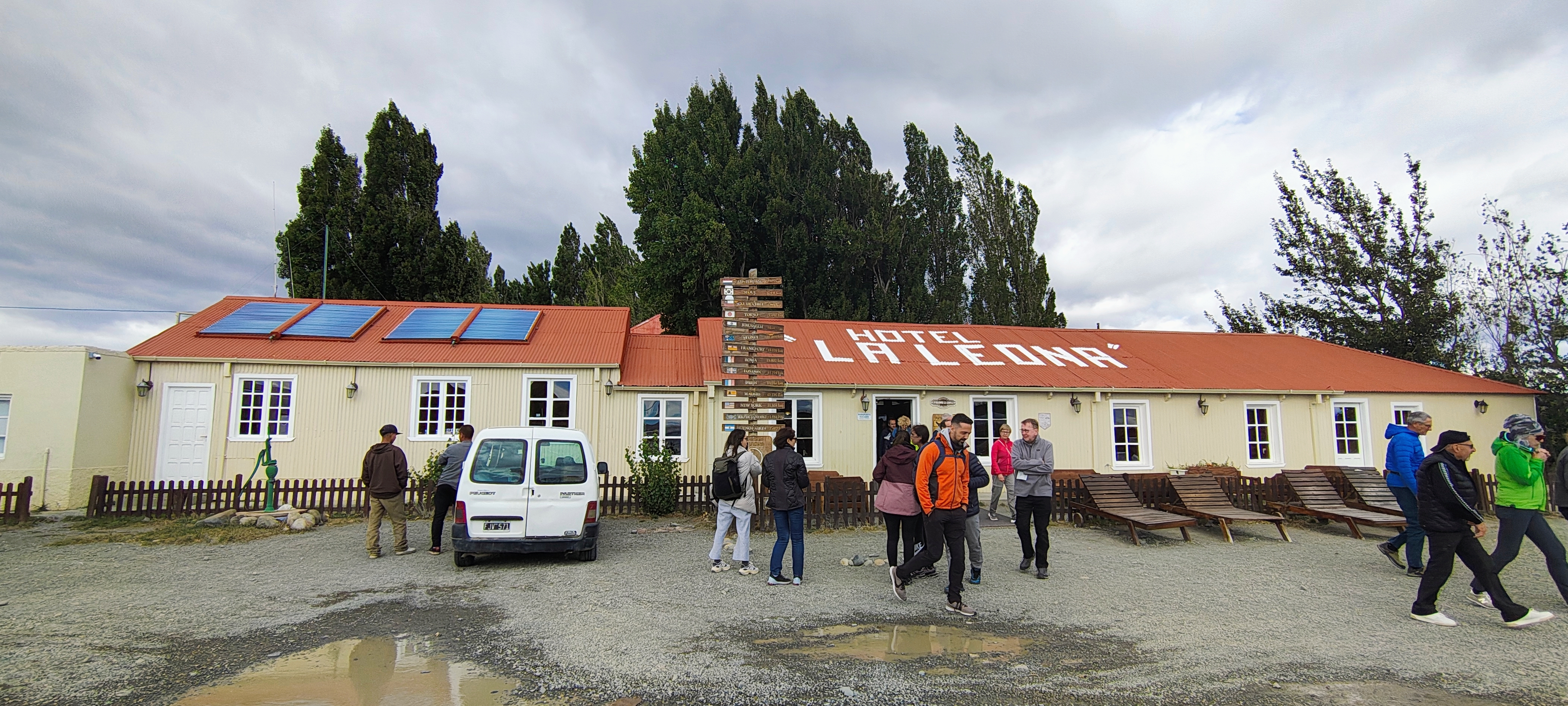 Reanuda el viaje por carretera alargada y recta rodeada de la soledad de la estepa, que no ofrece sombra donde cobijarse, aunque el sol apenas se asoma entre las nubes, hasta llegar a la siguiente parada en La Leóna, un complejo de turismo al sur del lago Viedma y junto al río Leóna.