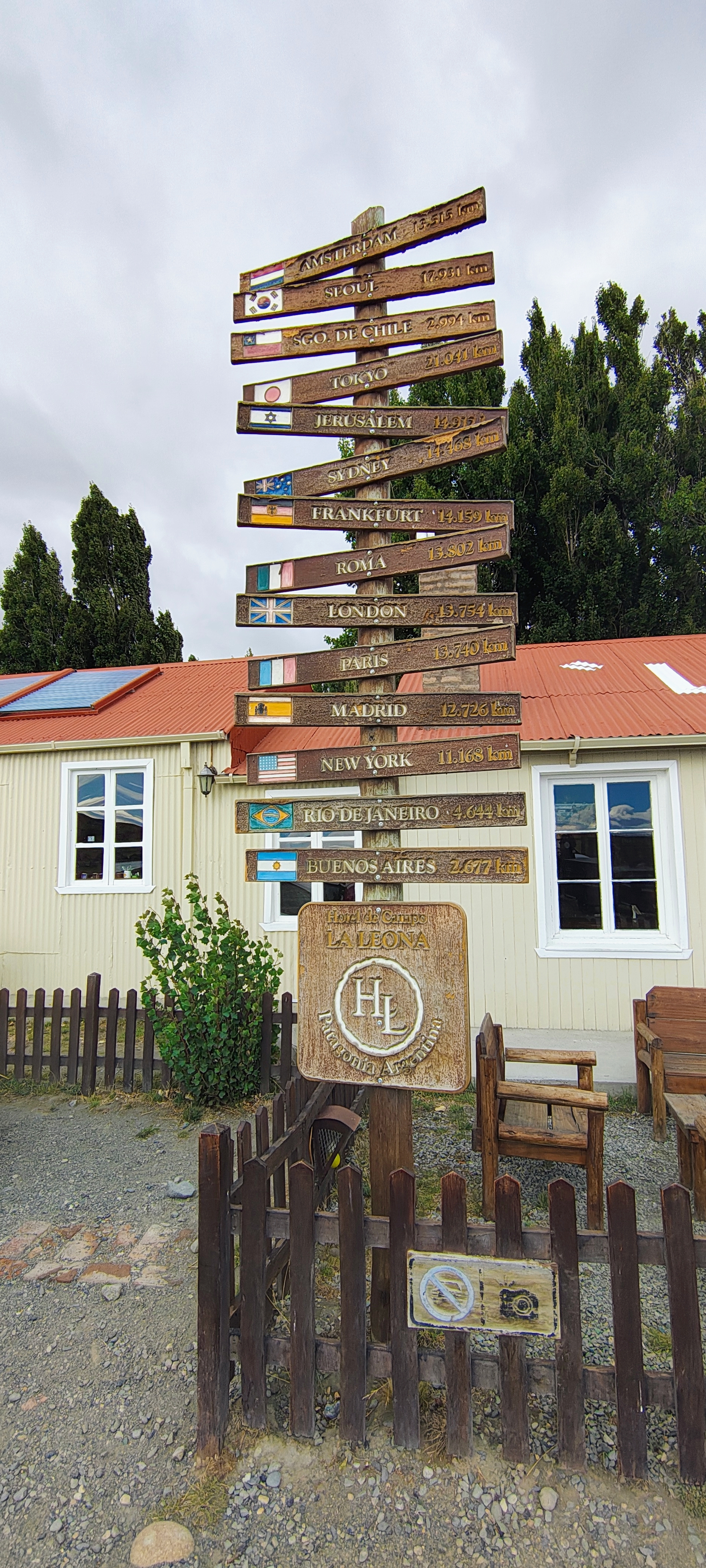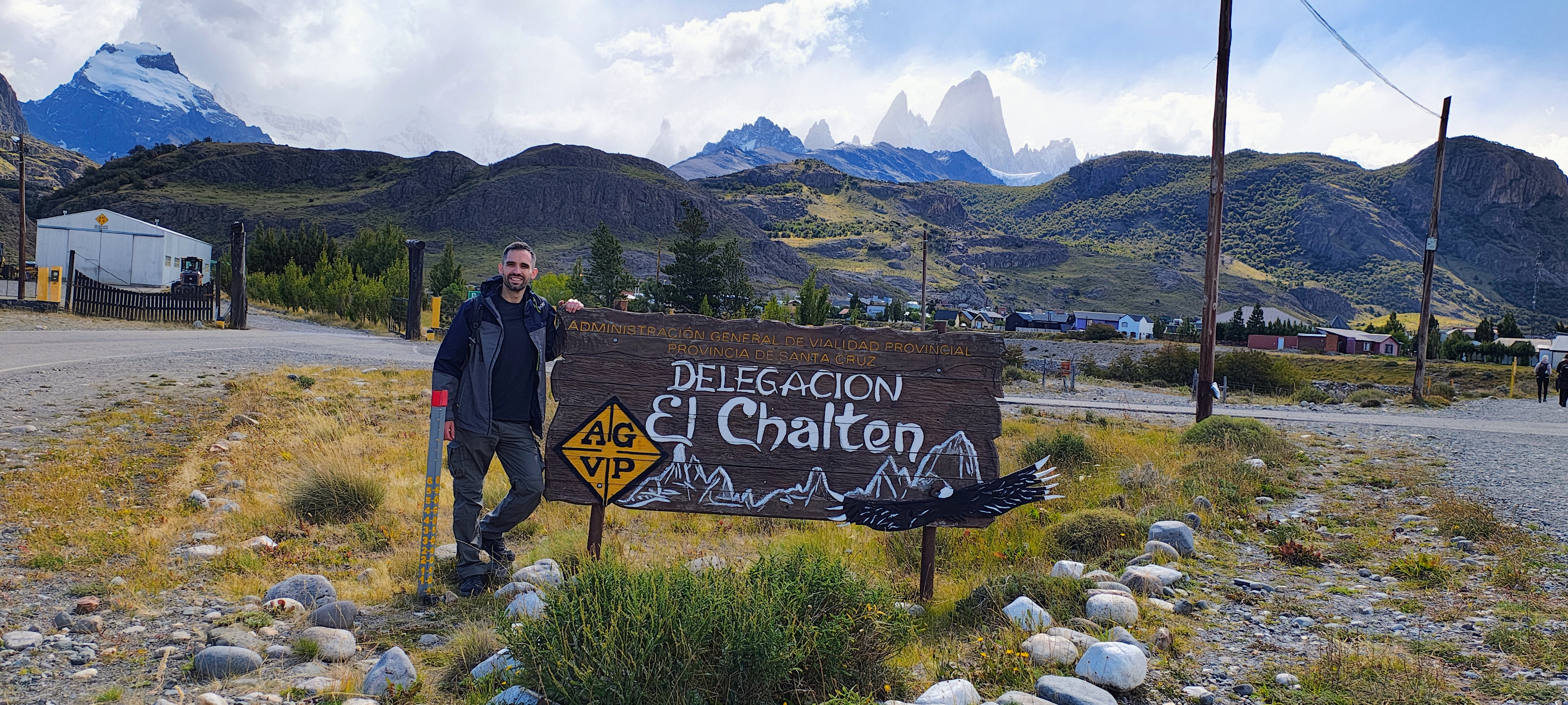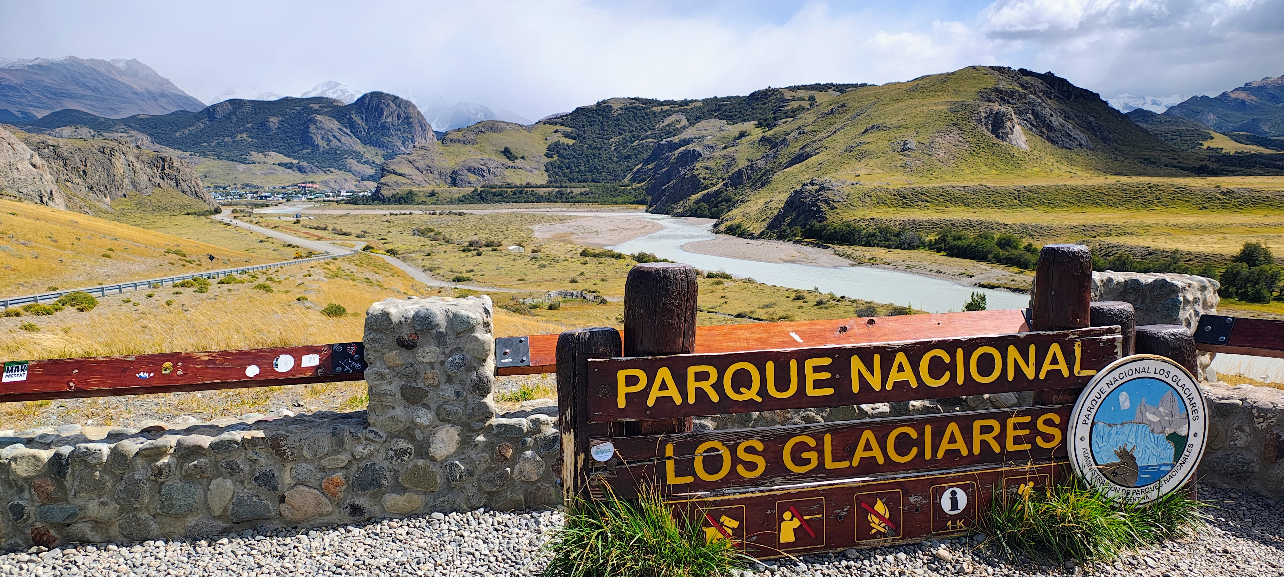 Han parado cerca del destino para admirar el paisaje del río con las casas del Chaltén, junto al cartel del parque Nacional de los Glaciares, aunque las paredes del Cerro El Chaltén o De Fitz Roy están tapadas de nubes.