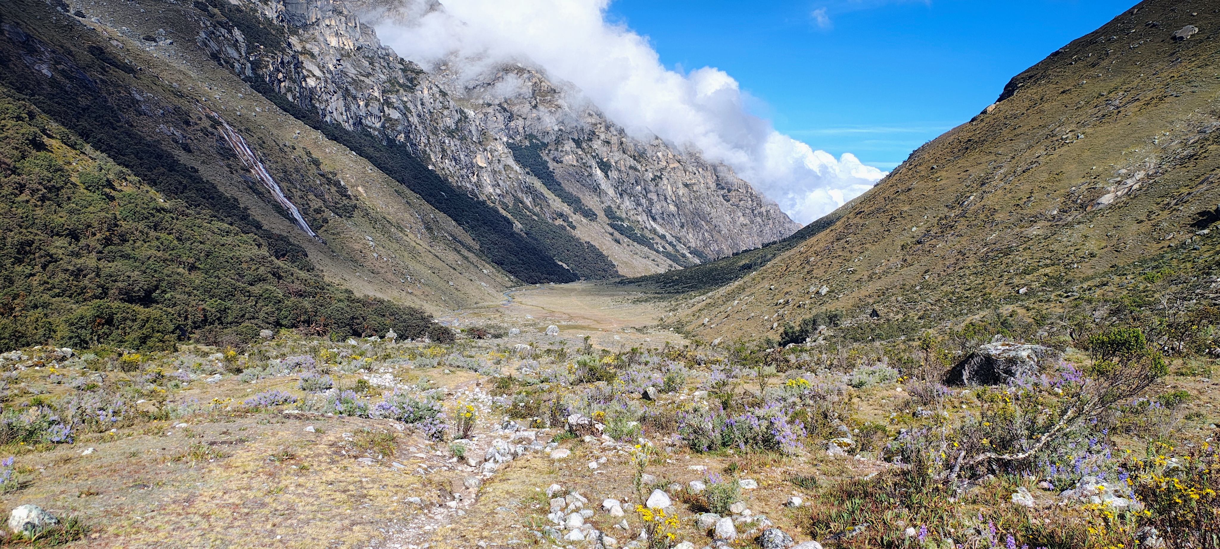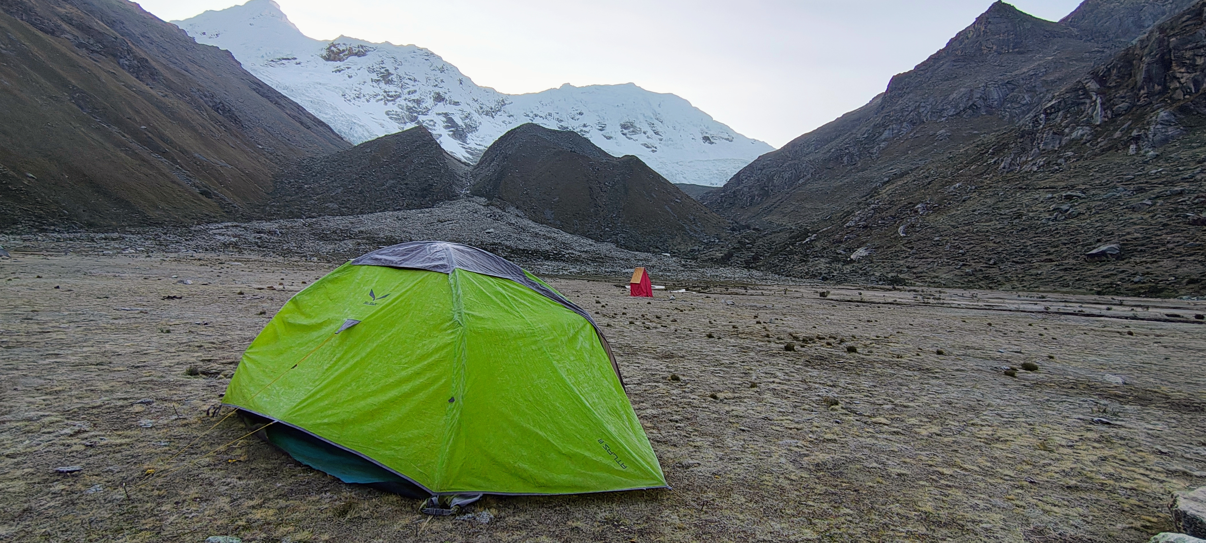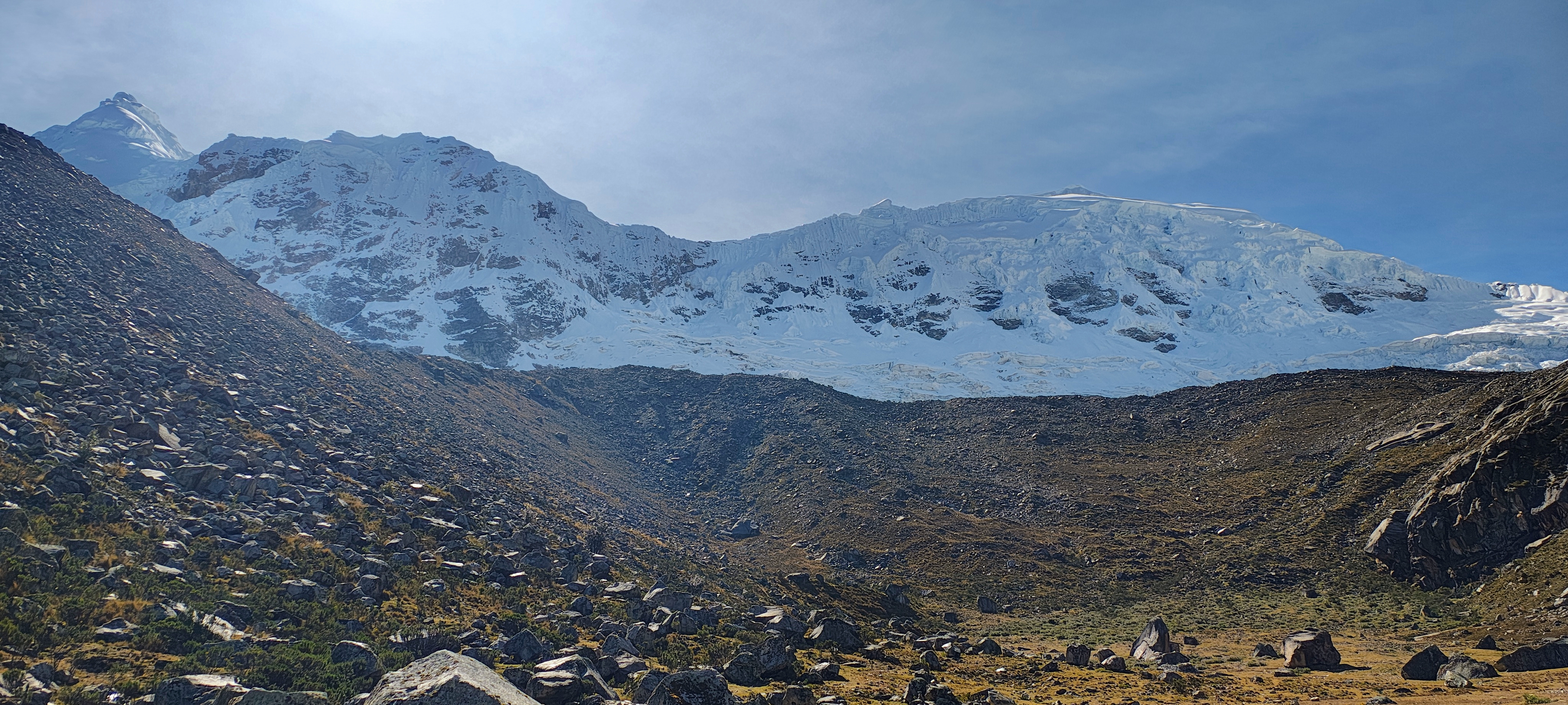 Desde abajo parece muy difícil la subida, y lo es, si no estás aclimatado como yo.  Seguimos avanzando por el valle y subimos una terraza  donde salimos a una llanura donde están los restos de un  campo base para subir al Tocllaraju..