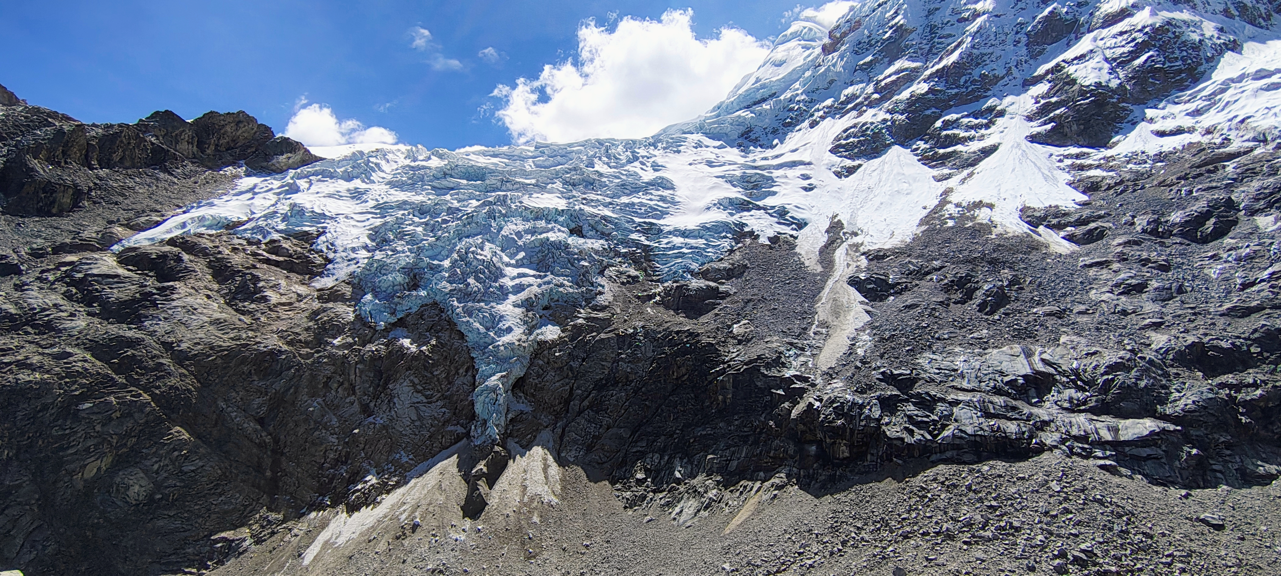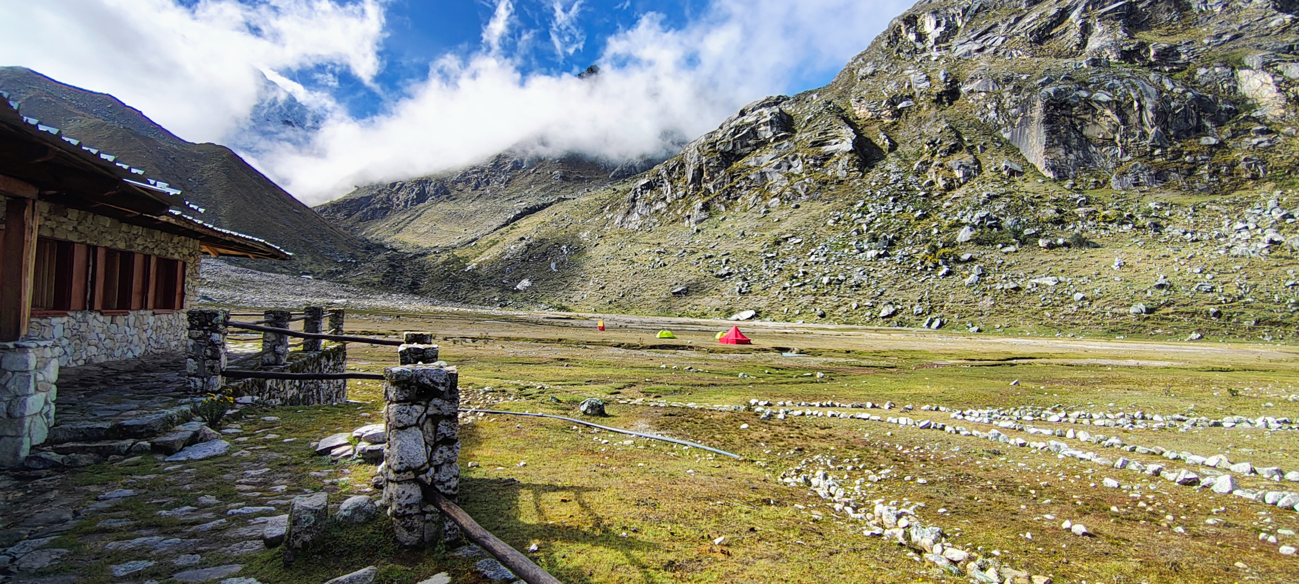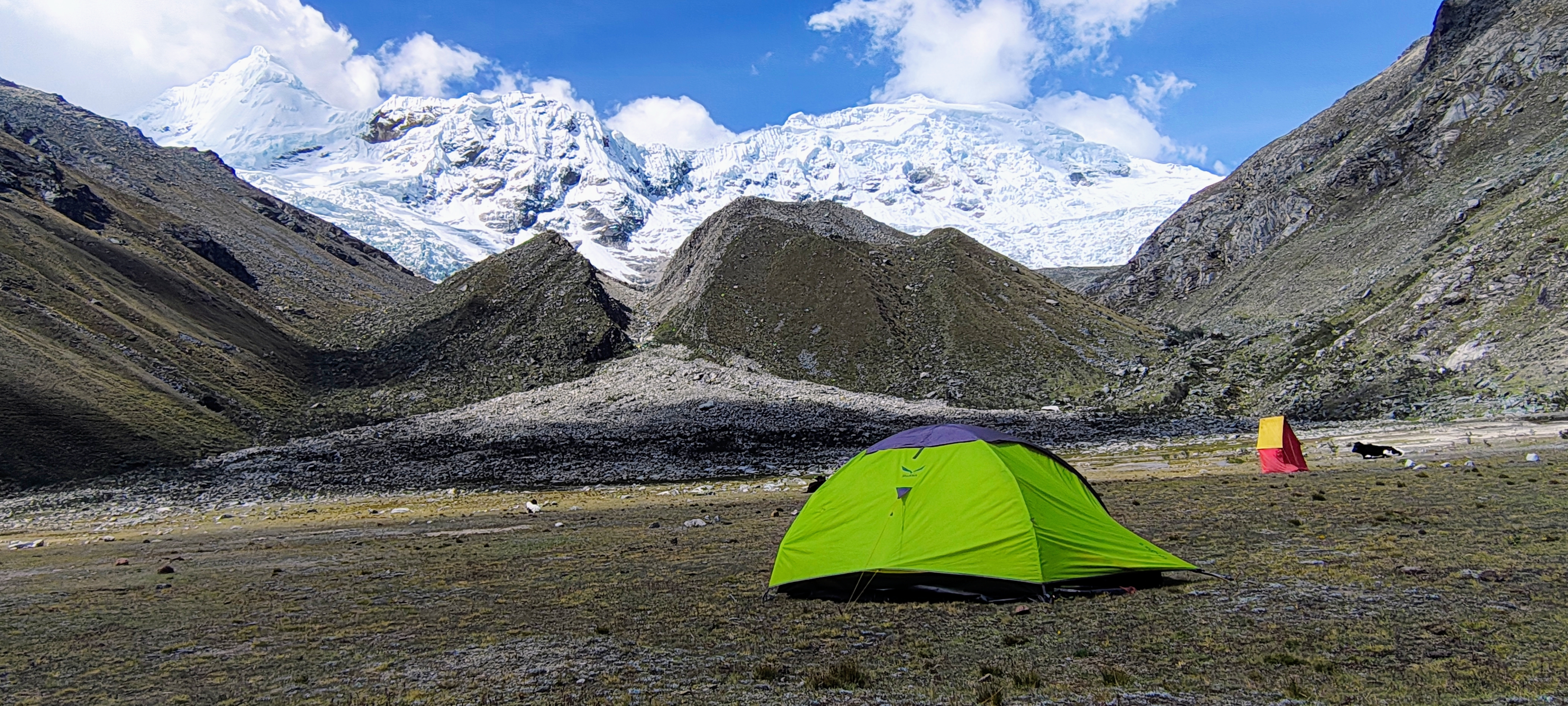 Desde abajo parece muy difícil la subida, y lo es, si no estás aclimatado como yo.  Seguimos avanzando por el valle y subimos una terraza  donde salimos a una llanura donde están los restos de un  campo base para subir al Tocllaraju..