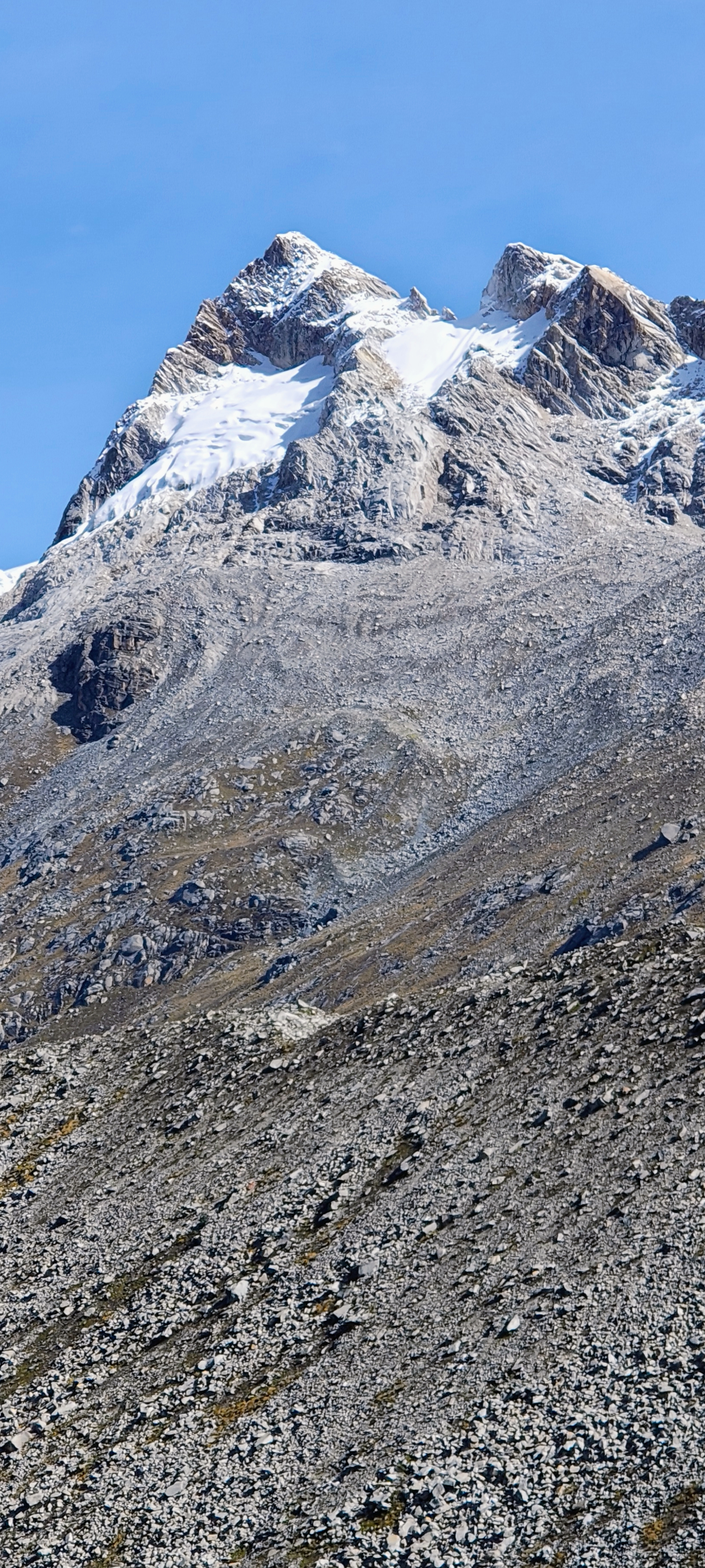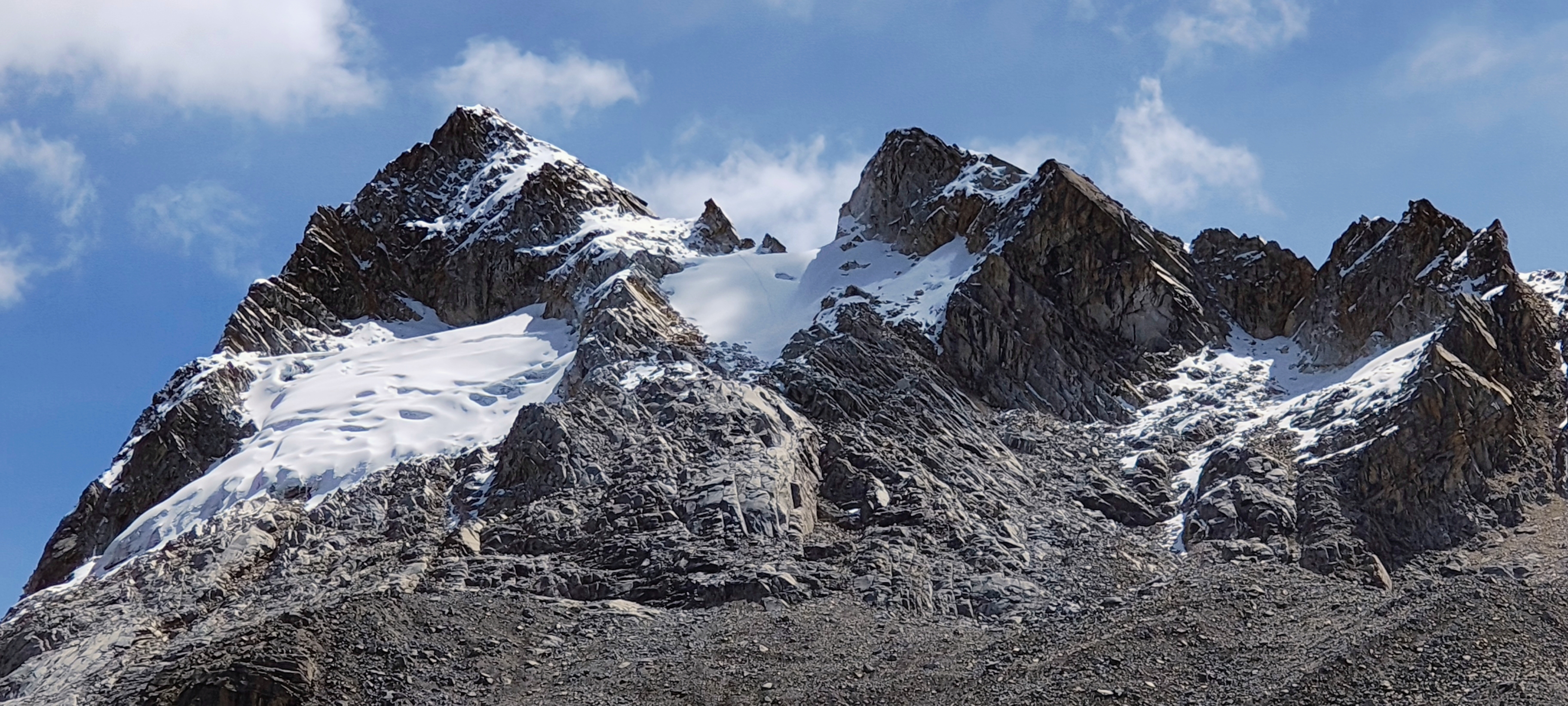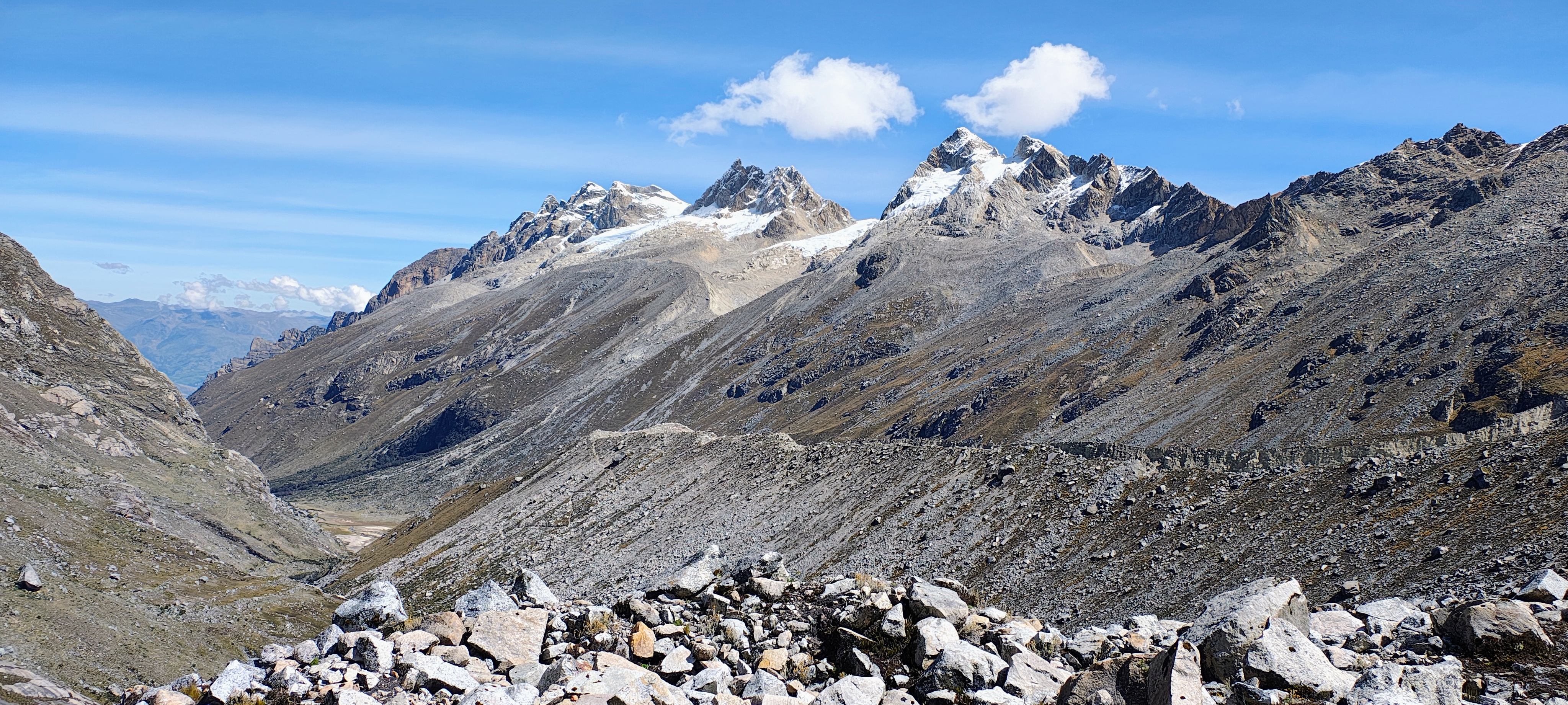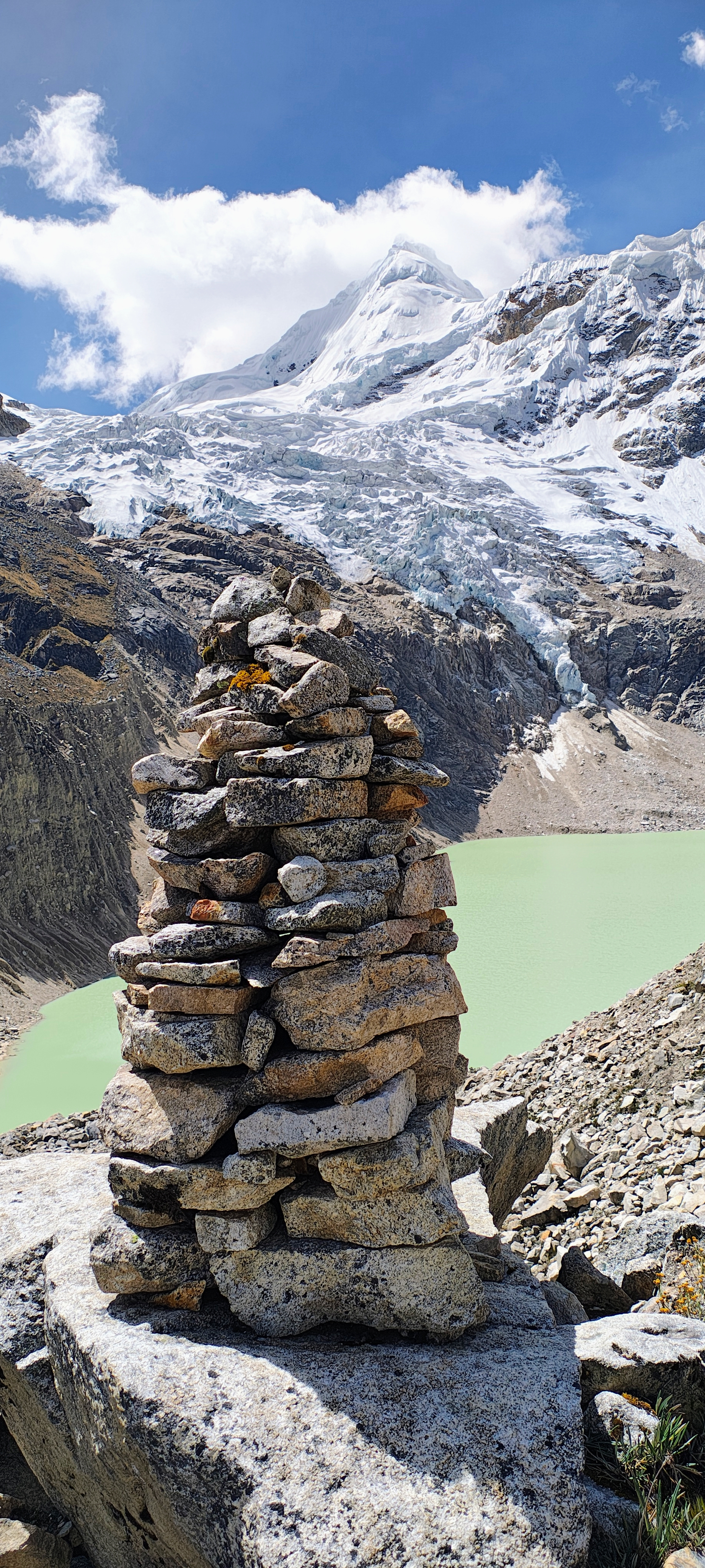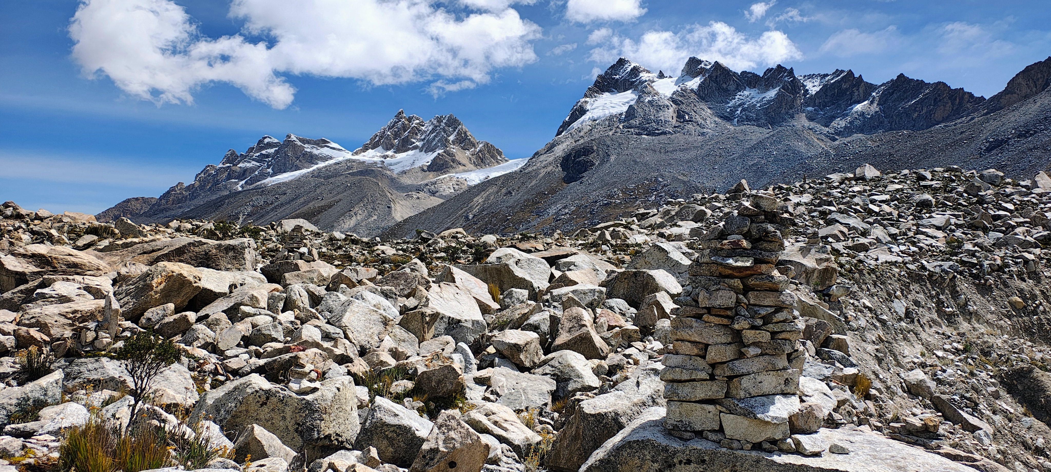 Y llegamos al final de la arista desde donde hay un hito enorme de piedras y a lo lejos se ven algunos más, además  se percibe el Tocllaraju  en su plenitud y desde allí tomamos una vereda que nos lleva de vuelta.