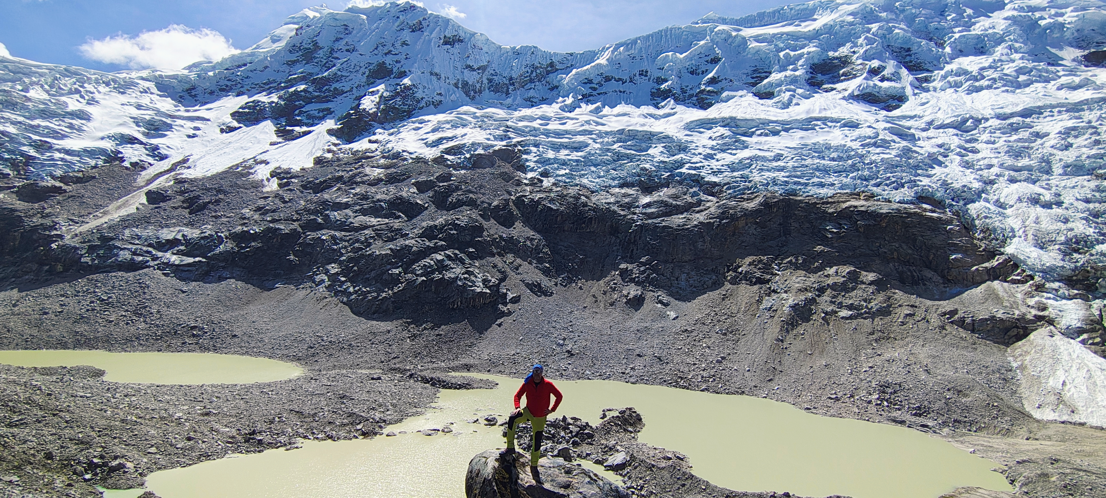 El día es maravilloso, está todo lleno de luces, vamos pedreando por la cresta del borde de la laguna Milluacocha, y apreciando cada vez más la cumbre del Tocllaraju y su gran glaciar que lo cubre.
