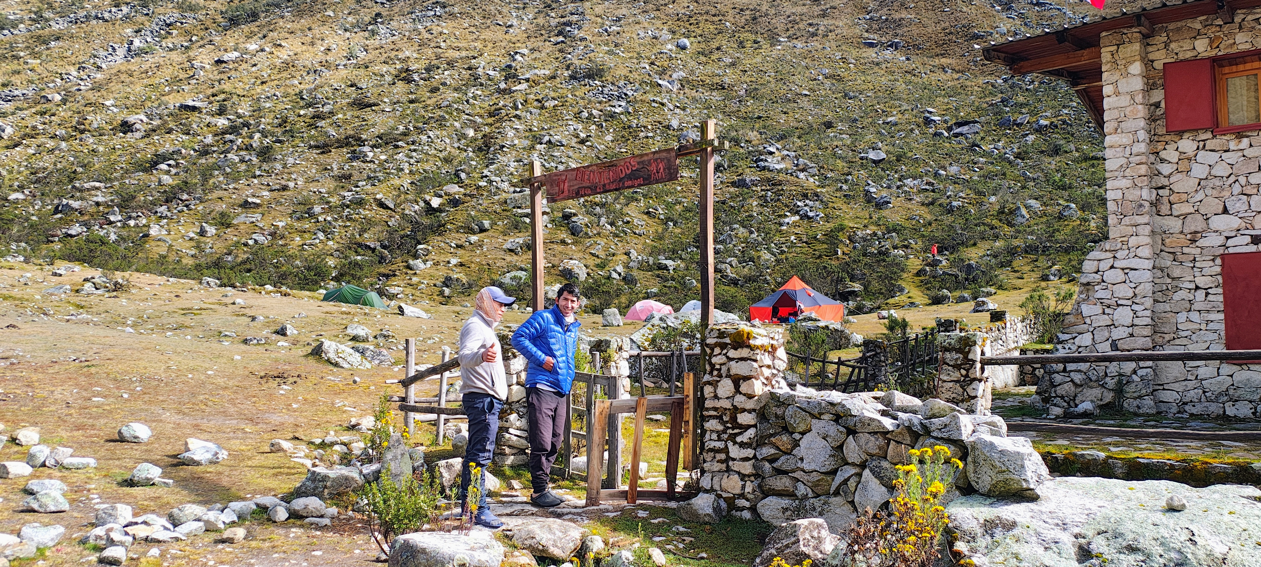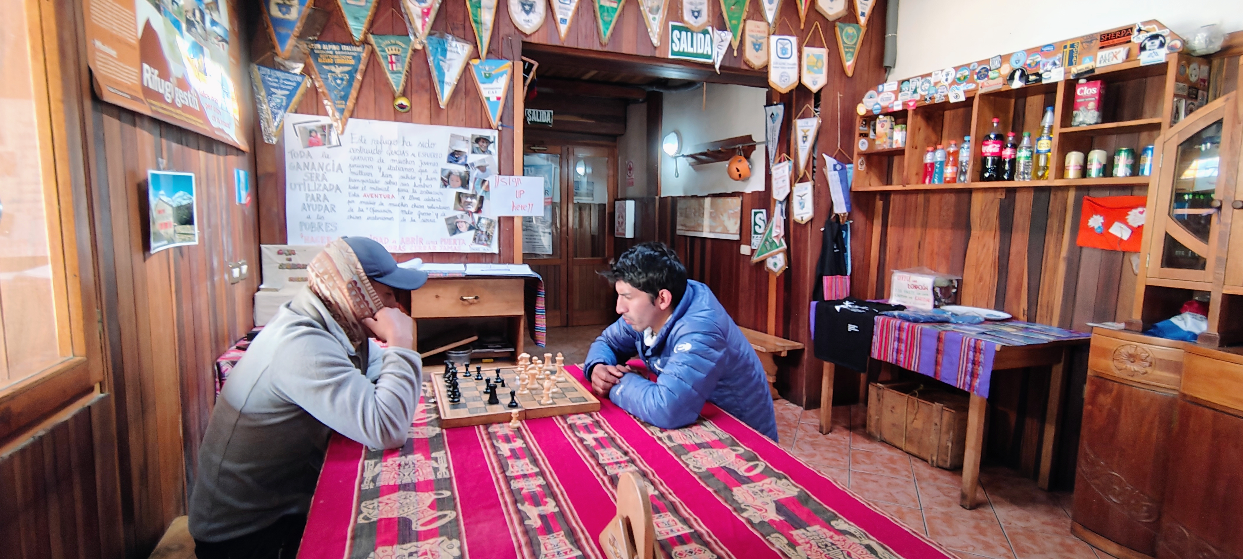 Nos despertamos y desayunamos a las ocho, luego vamos al refugio  de Ishinca buscando la posibilidad de hablar con el exterior, ya que mañana haremos Ishinca y hay que organizar la vuelta, el guarda del refugio, un peruano muy amable, nos dice que desde la lluvia de por la noche están completamente incomunicados, algo se habrá roto en el temporal. Así que les va a tocar a Hosterlin y Fredy ascender a buscar cobertura para poder hablar. pero antes se echan una partida de ajedrez.