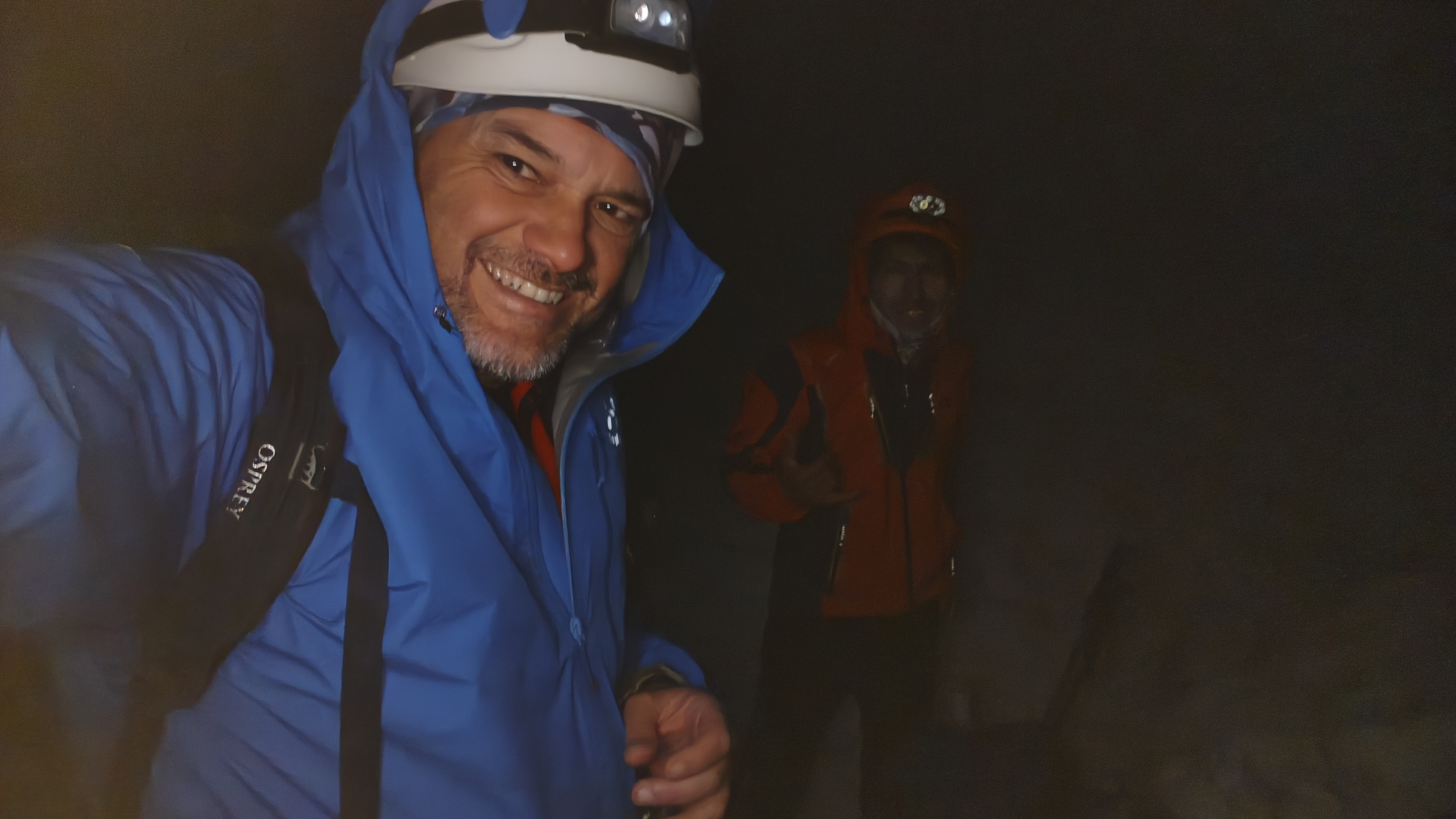 Hosterlin y Fredy se han subido a mitad de pendiente del Urus a buscar cobertura, necesitan llamar para anular la vuelta del día siguiente  de la expedición.
