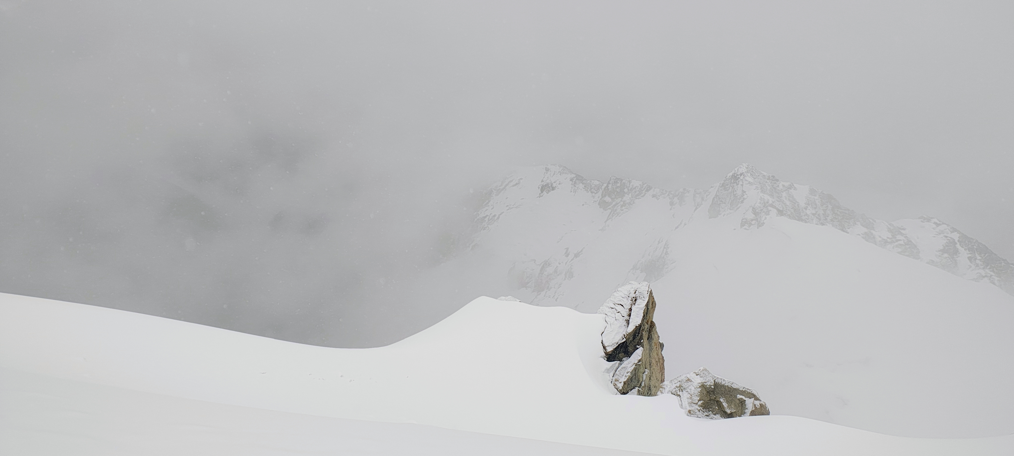 Y a pesar de esperar y esperar, no tiene pinta de abrirse, así que decidimos bajarnos, aunque se está muy bien aquí arriba, he sacado el piolet para la bajada, está muy vertical, a pesar de llevar las gafas amarillas de ventisca, no veo nada, cuando hay niebla, la luz se refleja en la nieve y todo aparece blanco sin diferenciar el cielo del suelo.