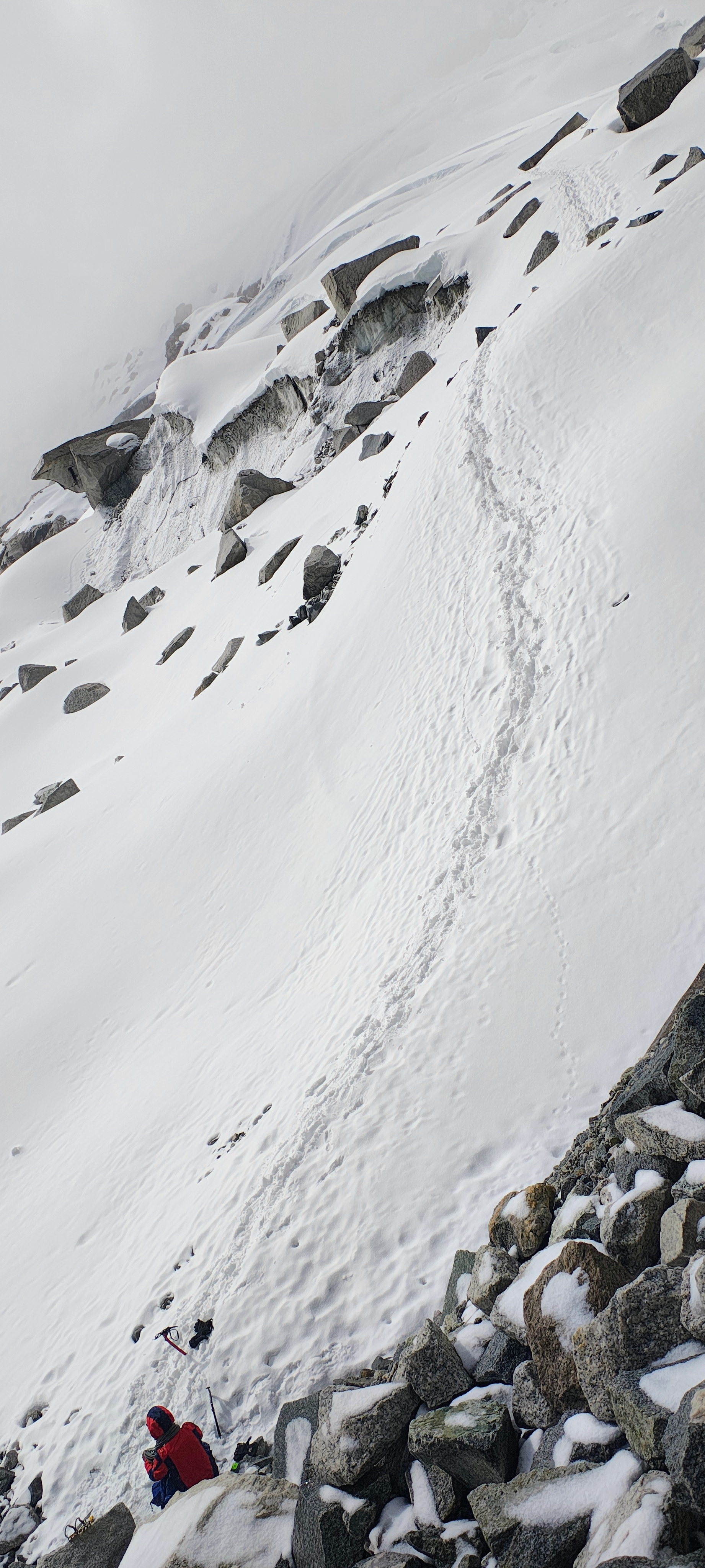 A medida que vamos avanzando  vemos el Urus en su totalidad, su subida muy vertical cruzando una canal hasta llegar al nevero que lleva a su base, para después  seguir a la izquierda buscando su cumbre por entre la roca y el hielo.
