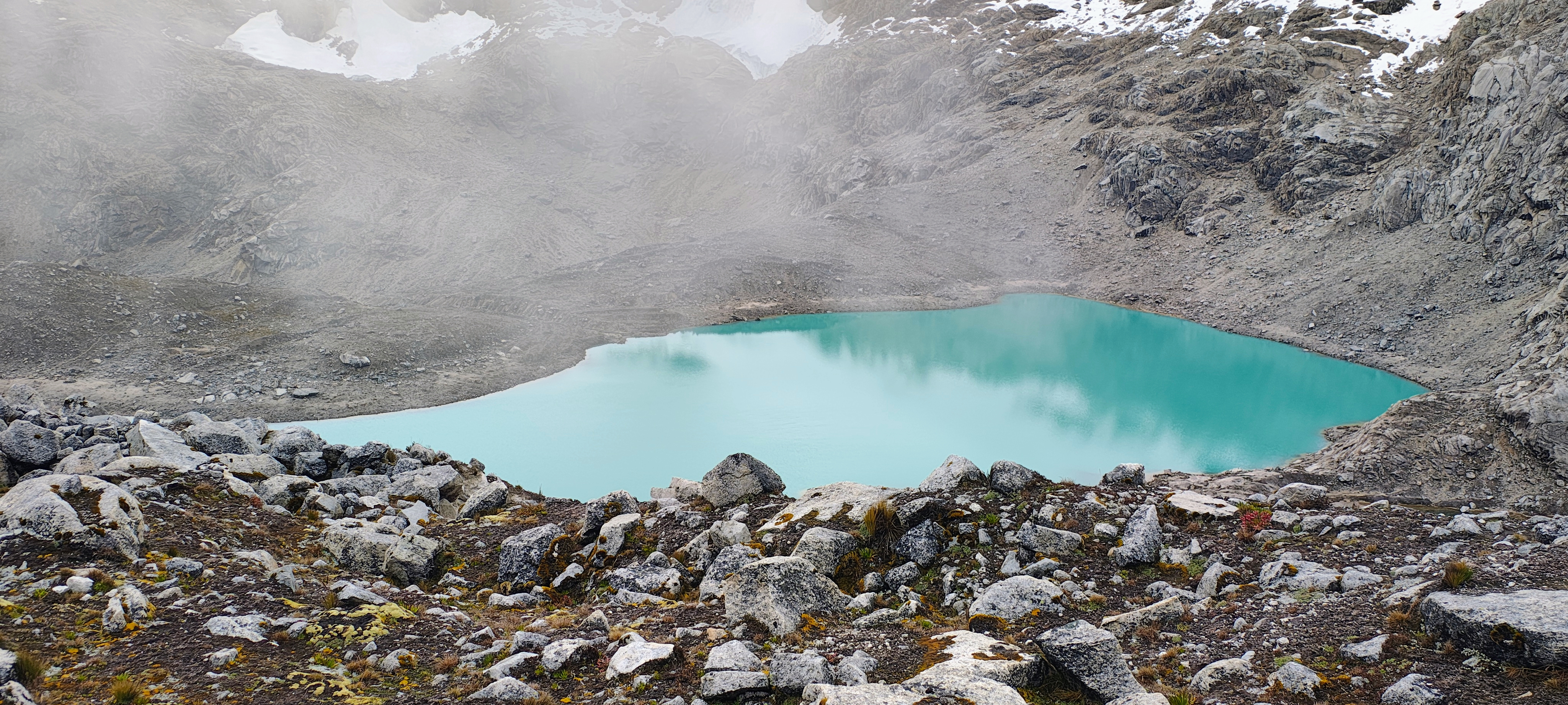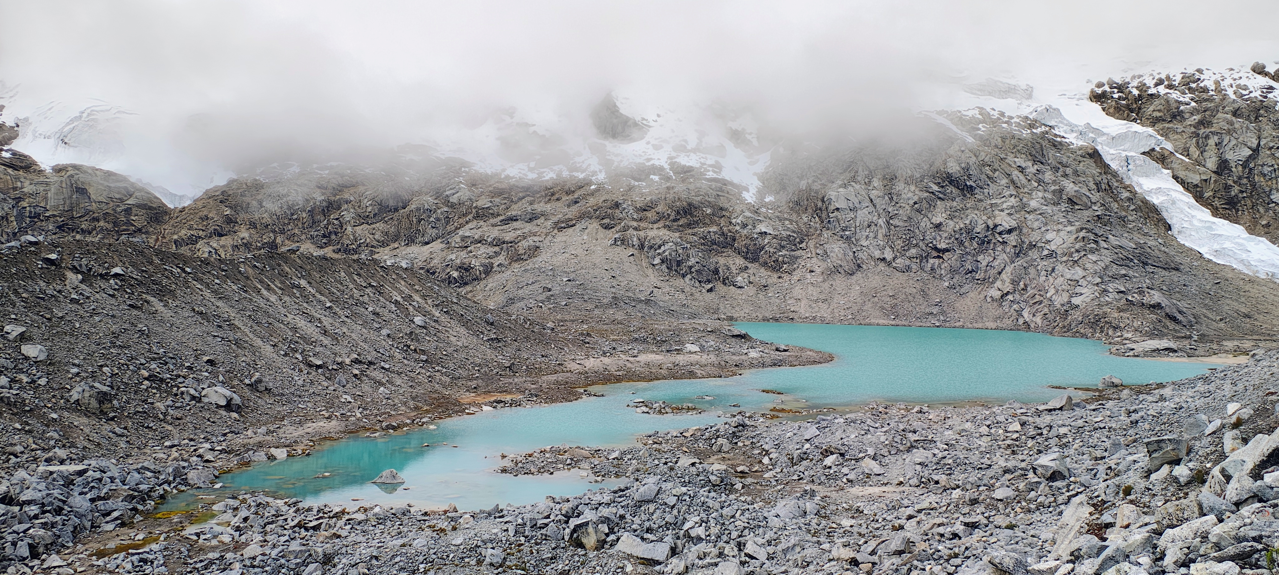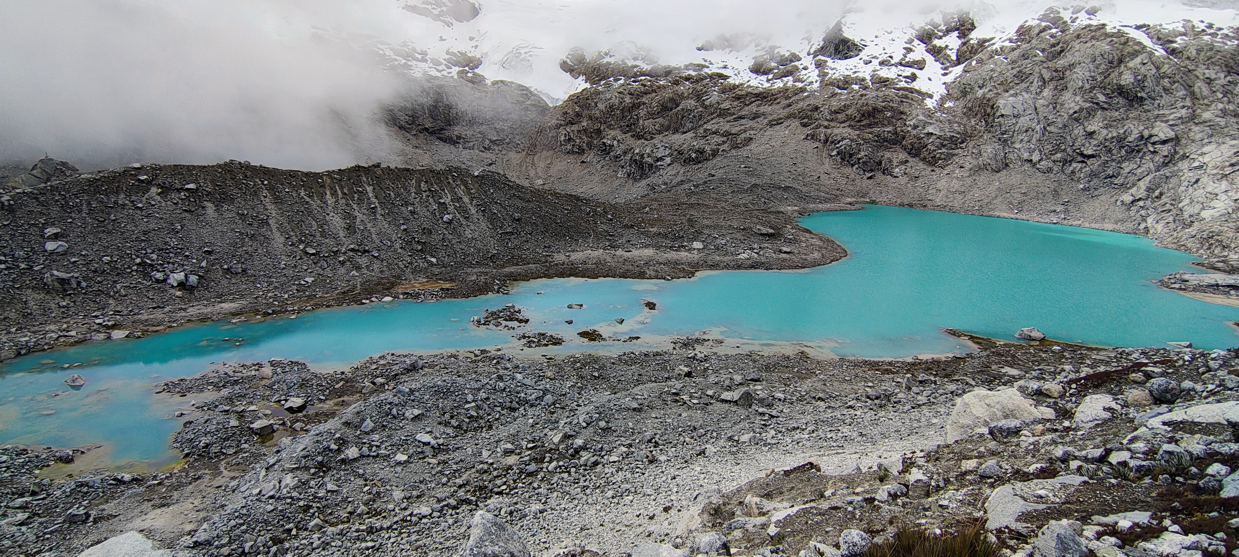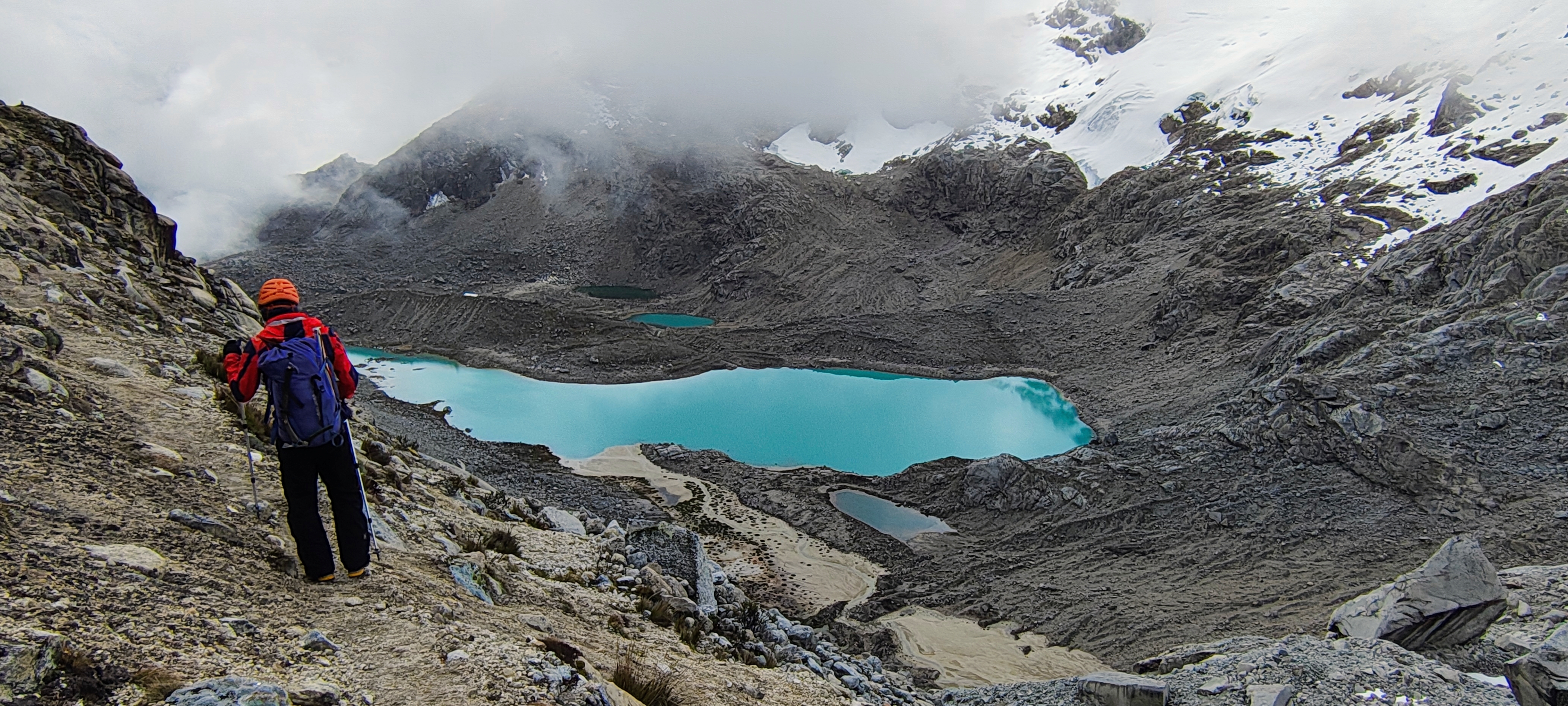 Ahora  llegamos a la laguna Ishinca desde arriba. De noche no la vi. Las cumbres están que se cubren y descubren, ahora no llueve por fortuna.