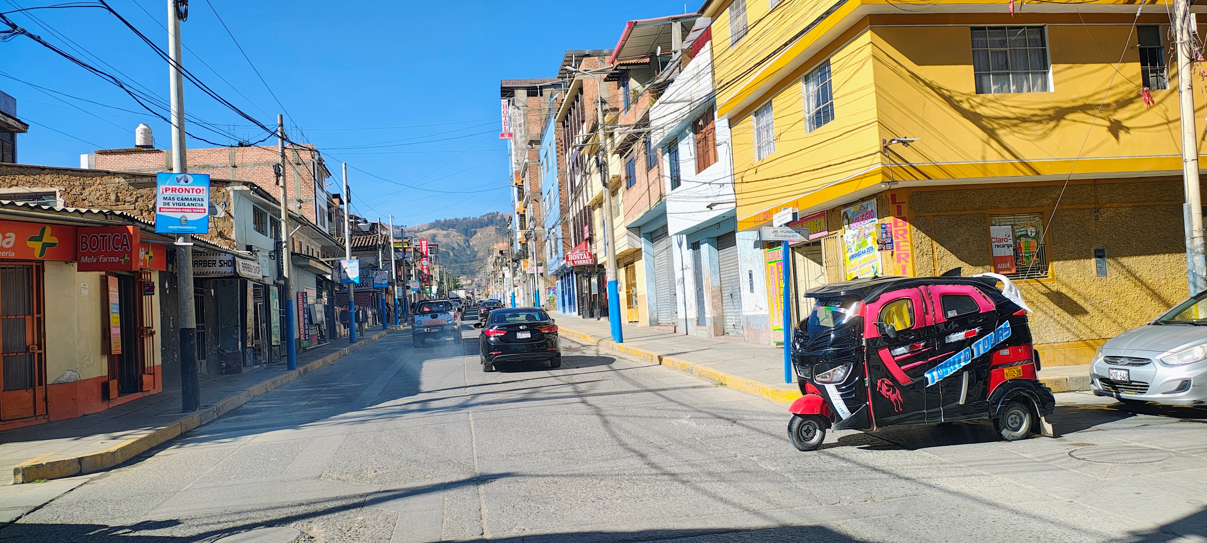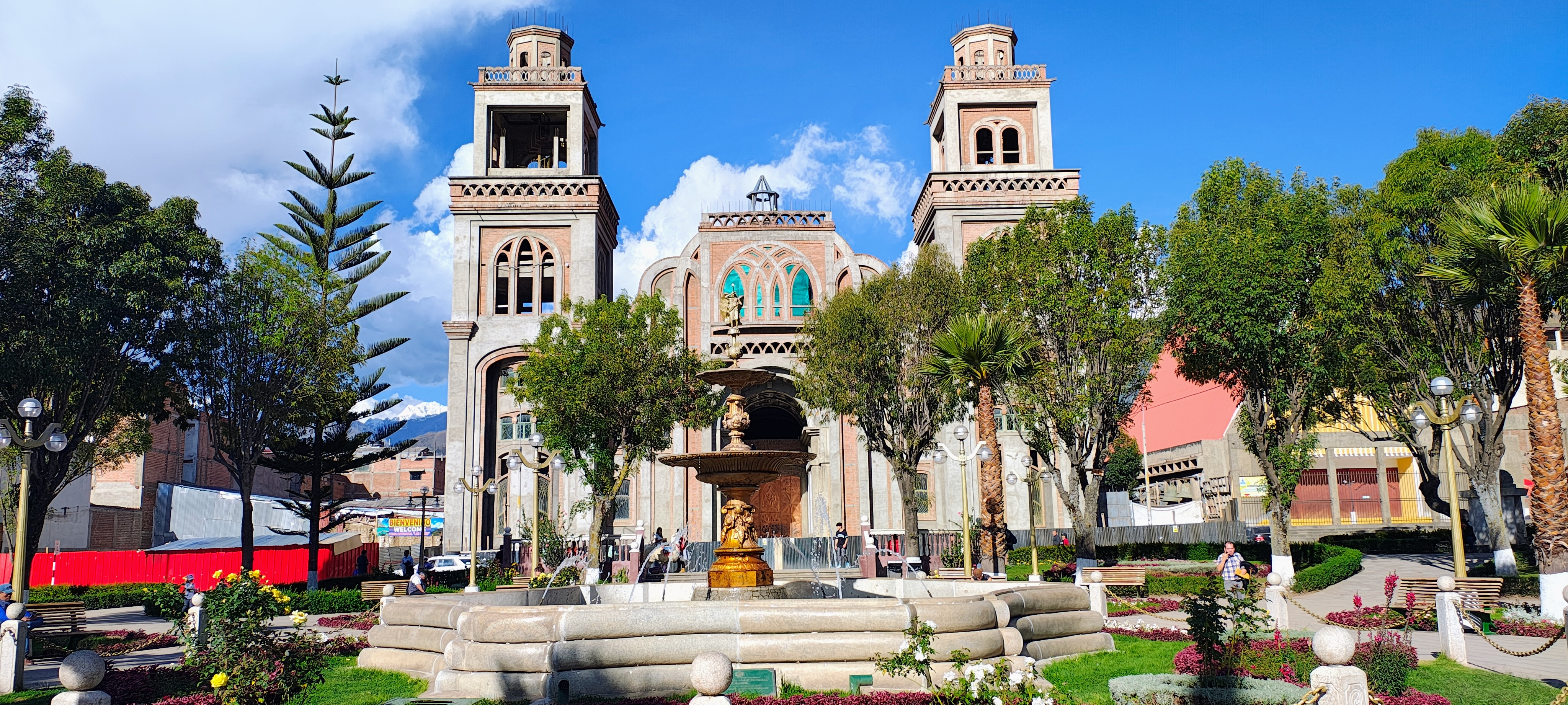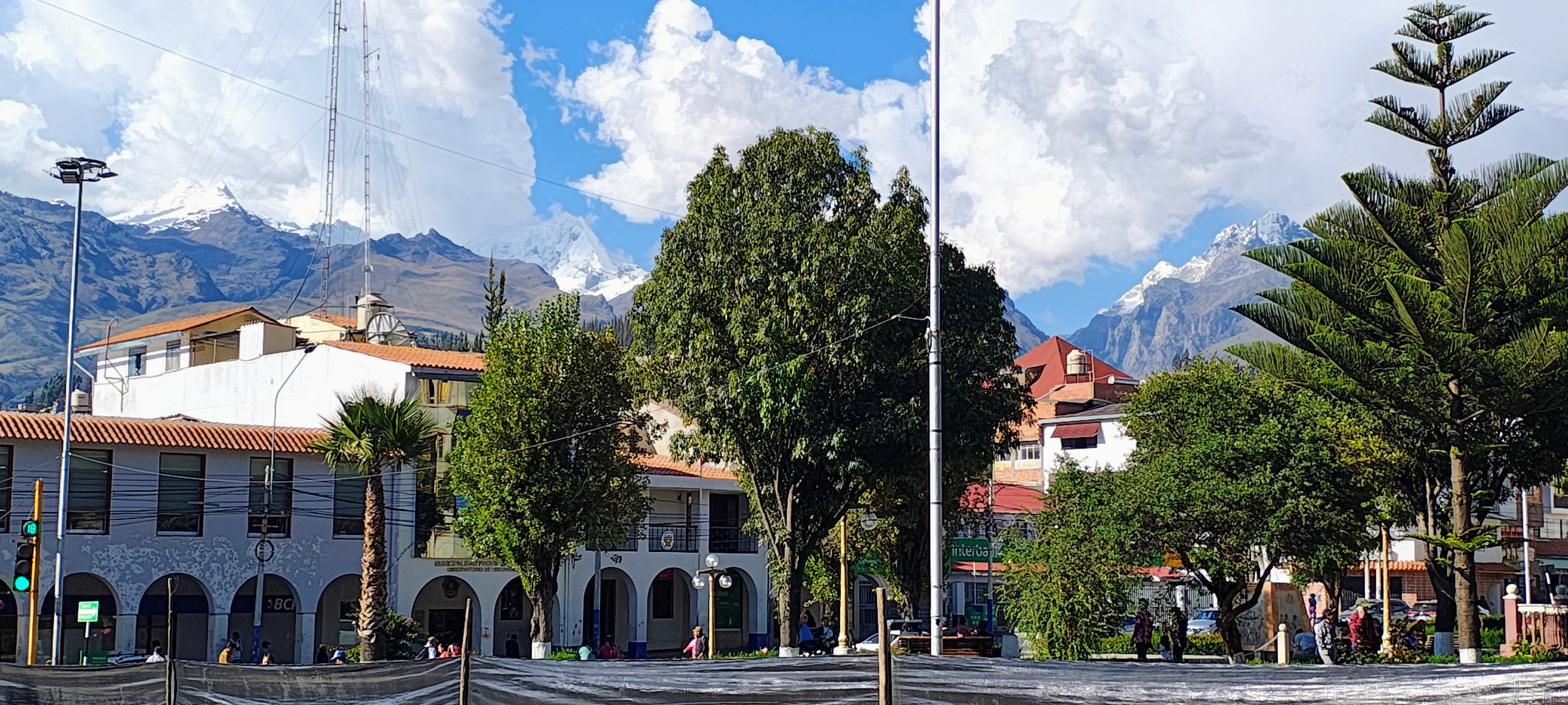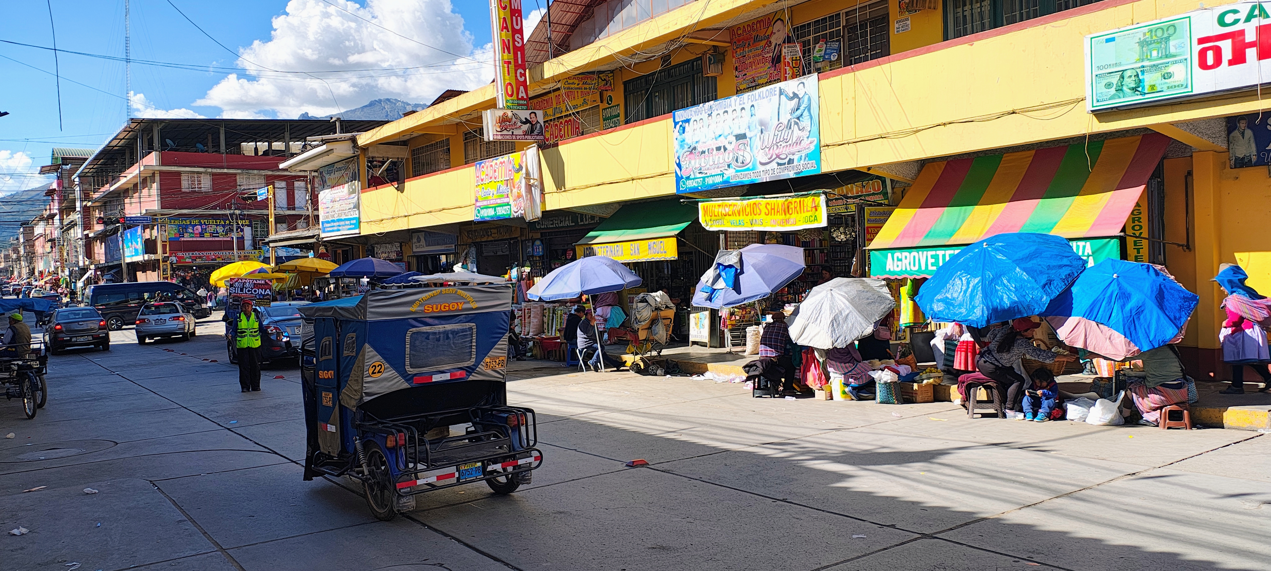 Huaraz con sus 145 mil habitantes es una ciudad llena de vida, cuyo centro alrededor del mercado es todo comercial, las mujeres ataviadas con sus ropas coloridas andinas y sus sombreros de bombín abombados venden frutas, comida, artesanías en las aceras delante de los comercios que se organizan en gremios y acaparan todas las calles mientras los coches y los triciclos pasan rápidamente casi sin orden tocando continuamente el claxon para no atropellar los peatones, pues lo carros tiene prioridad en esta parte del mundo.