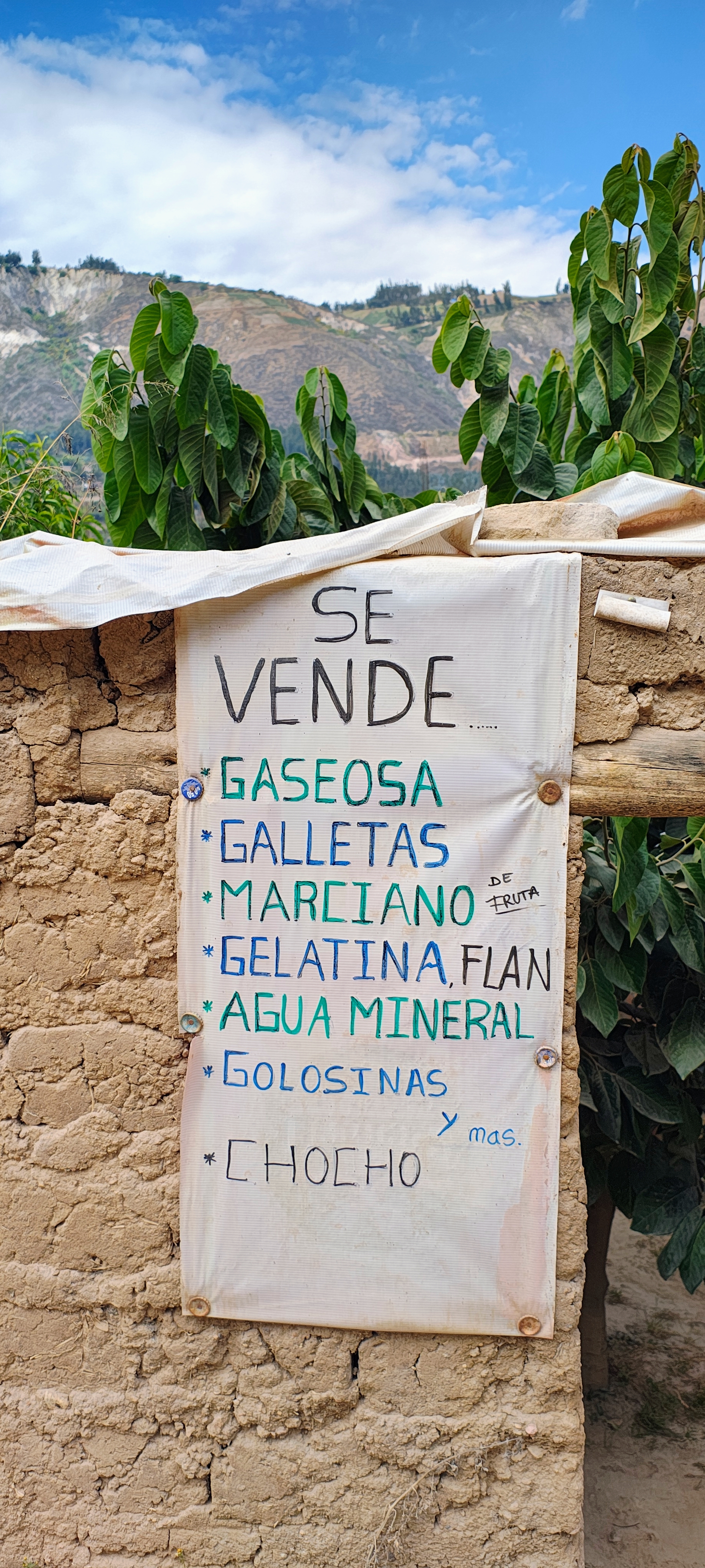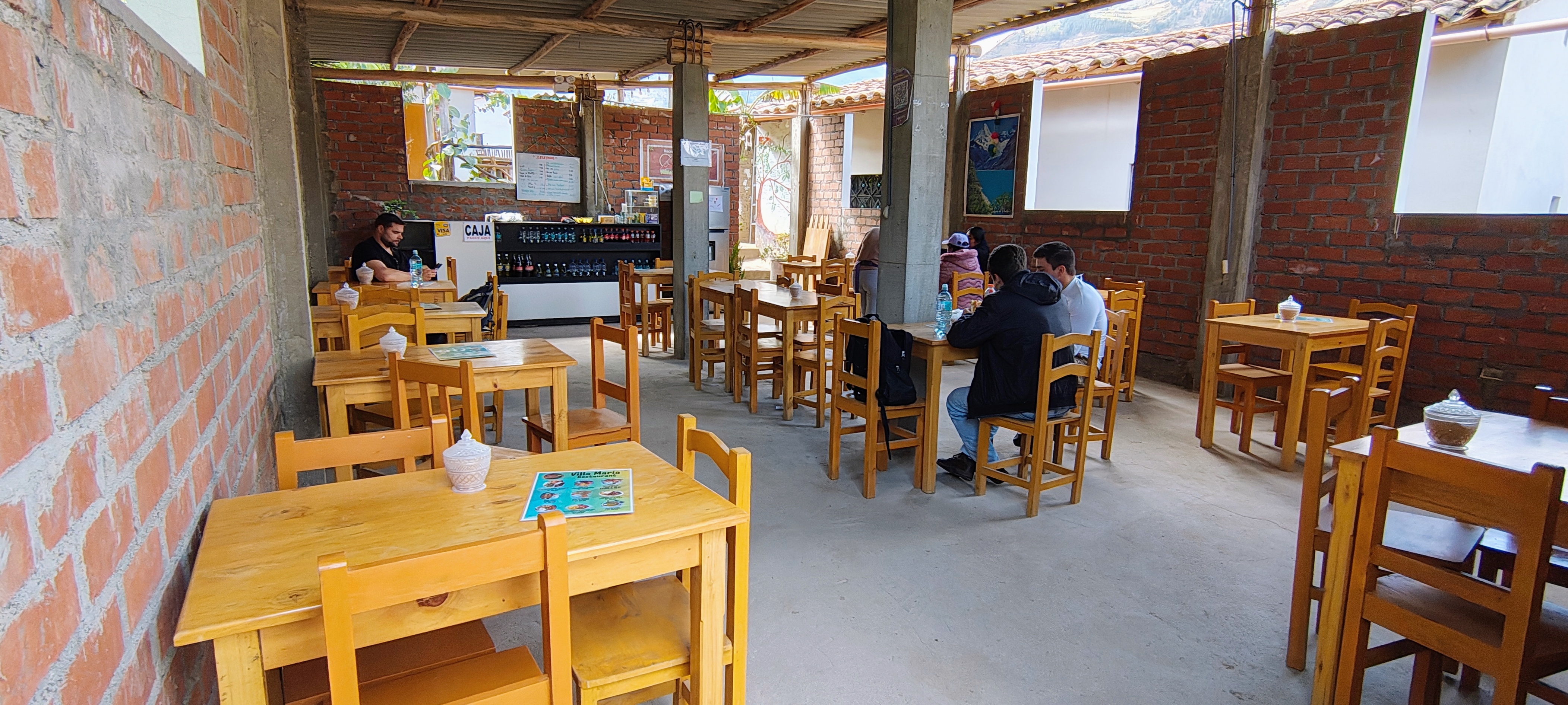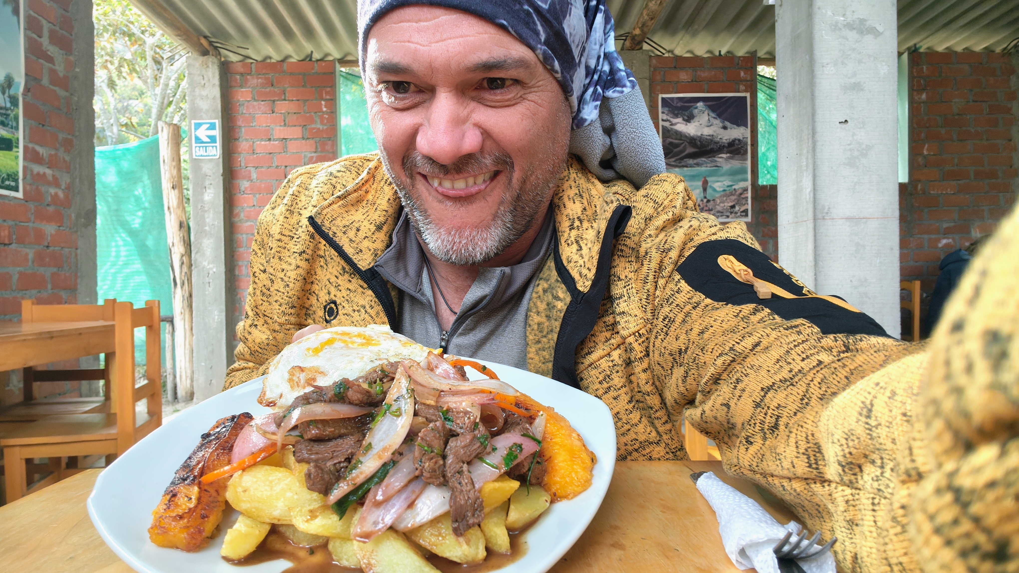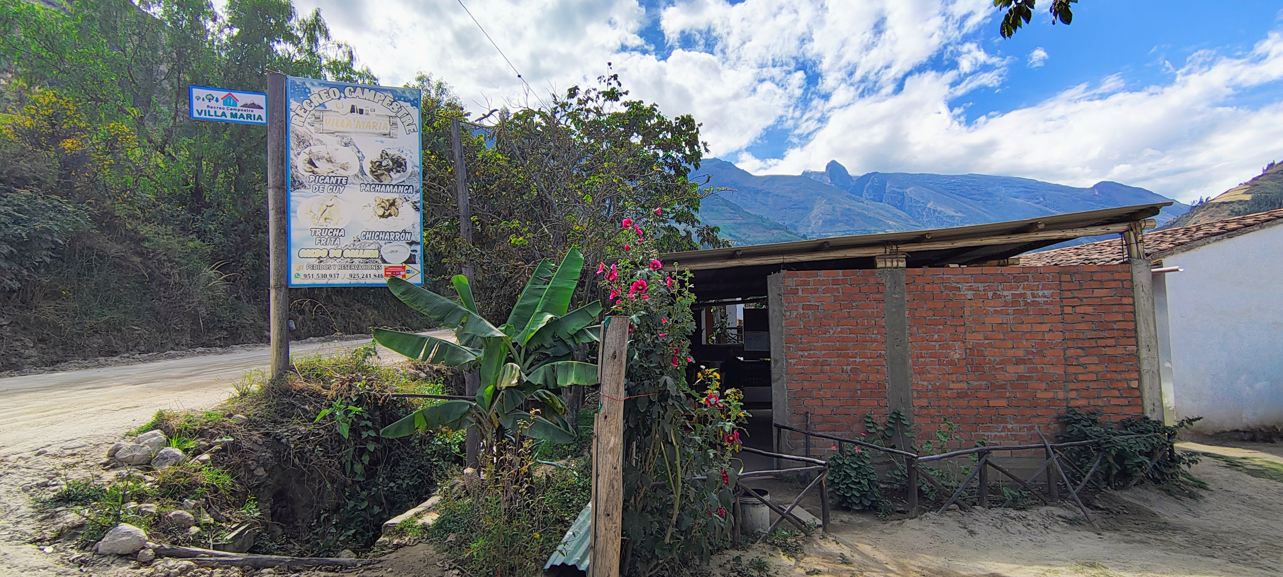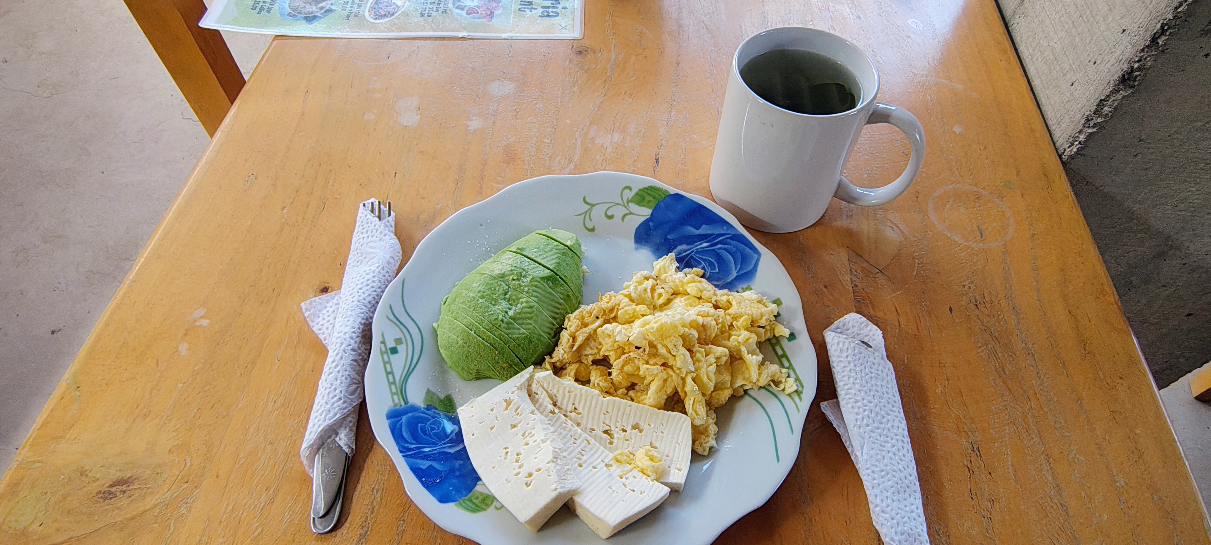 Nos paramos junto a la carretera una vez que nos desviamos del valle principal en Villa María, allí nos dieron desayuno, yo tomé un mate de coca con un plato de huevo, queso muy salado y aguacate, y pagamos el almuerzo por 48 soles en total ambas cosas.