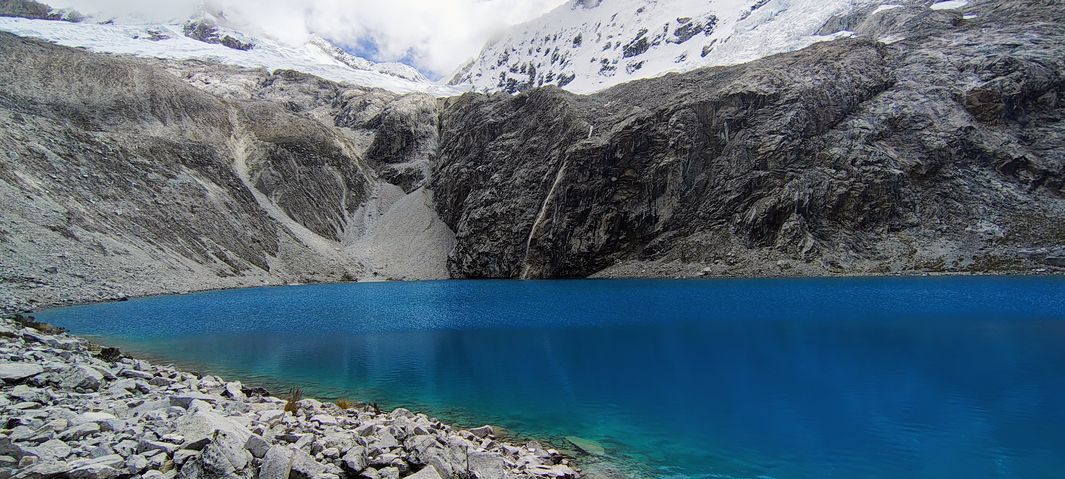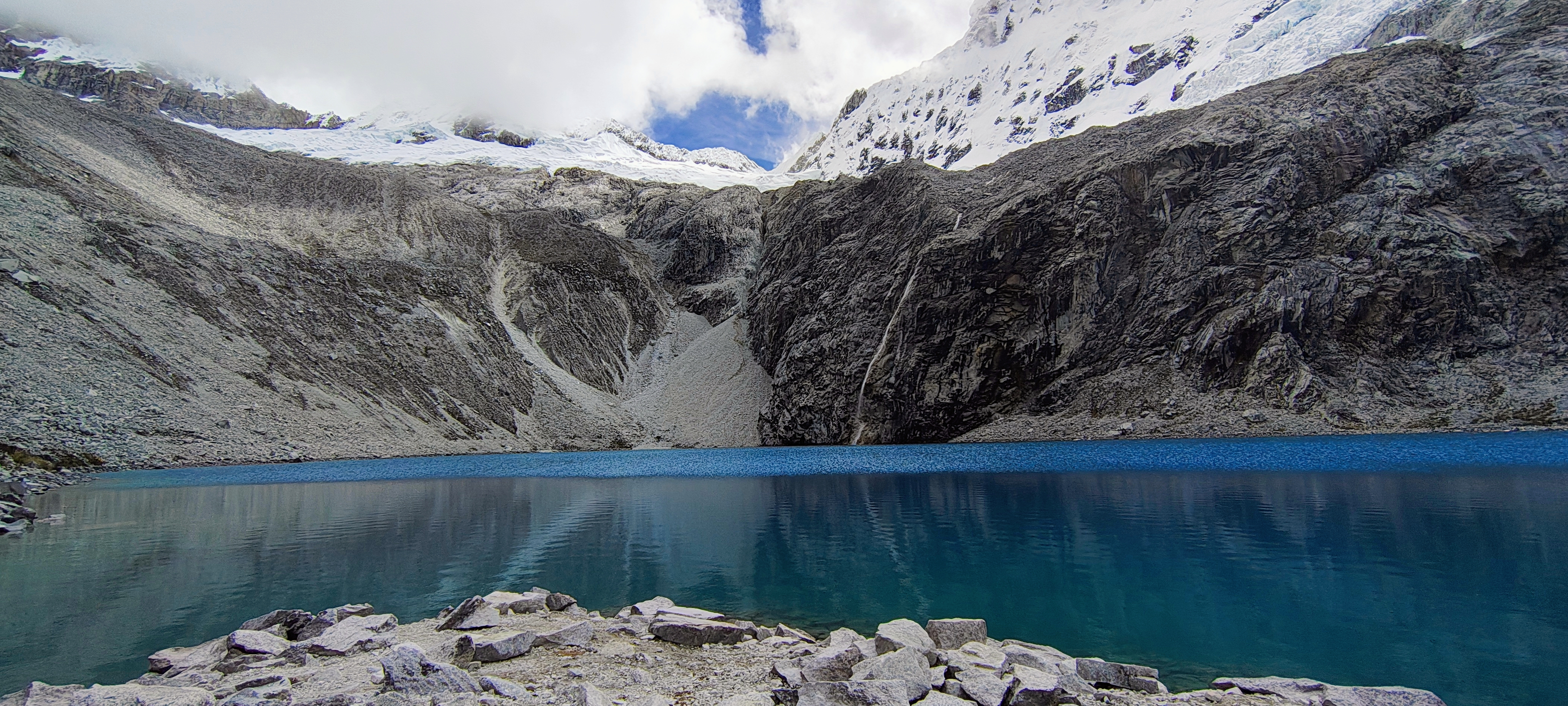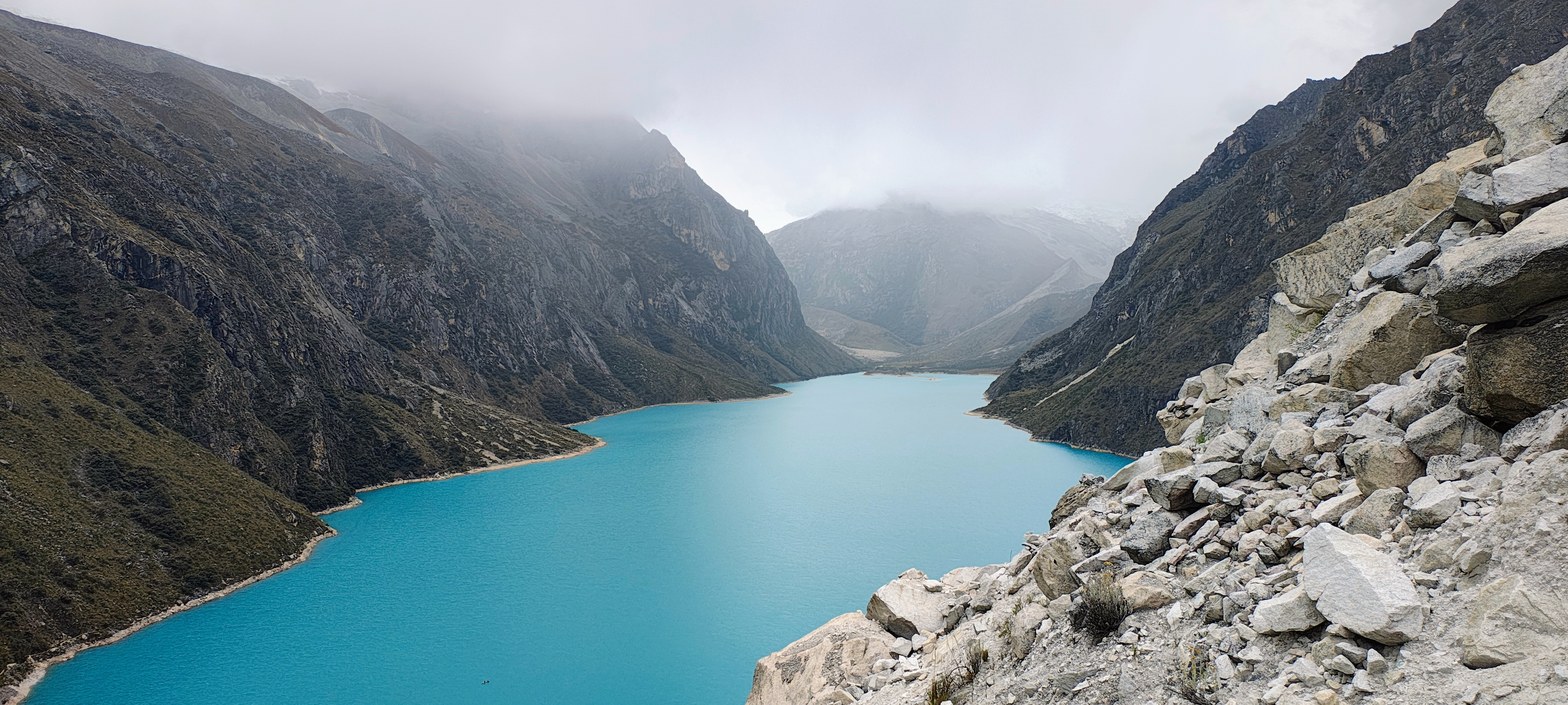 Veo las rocas que de la morrena que envuelve a la laguna 69, y llego a la laguna por fin.