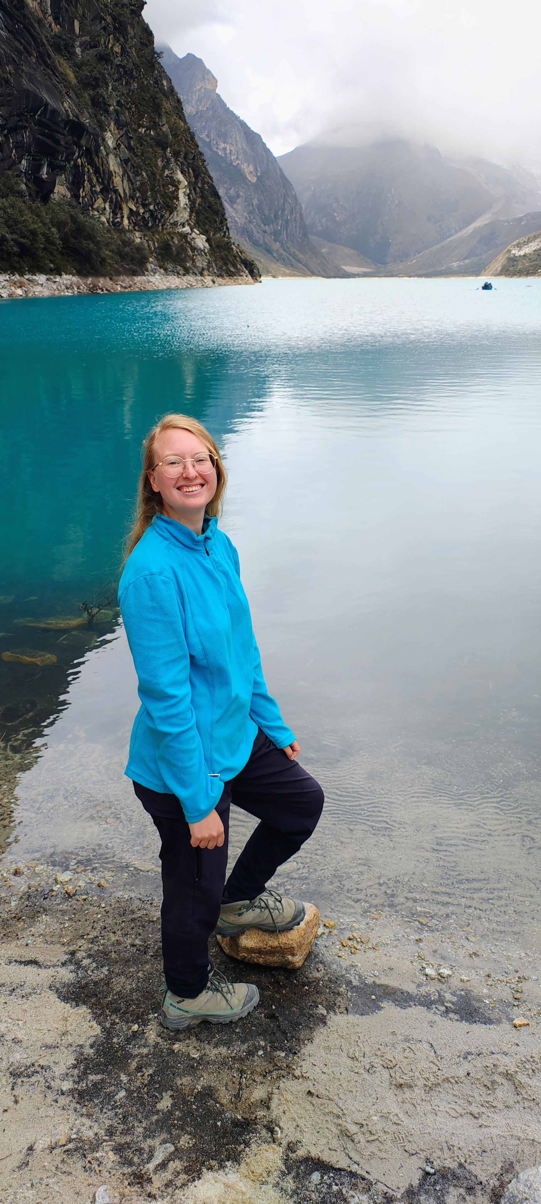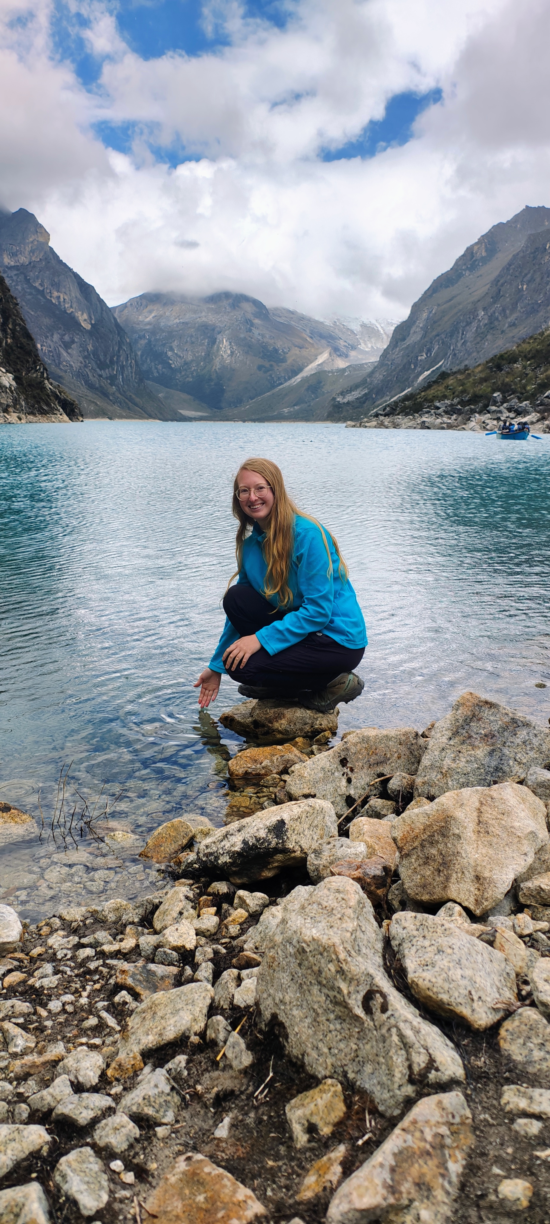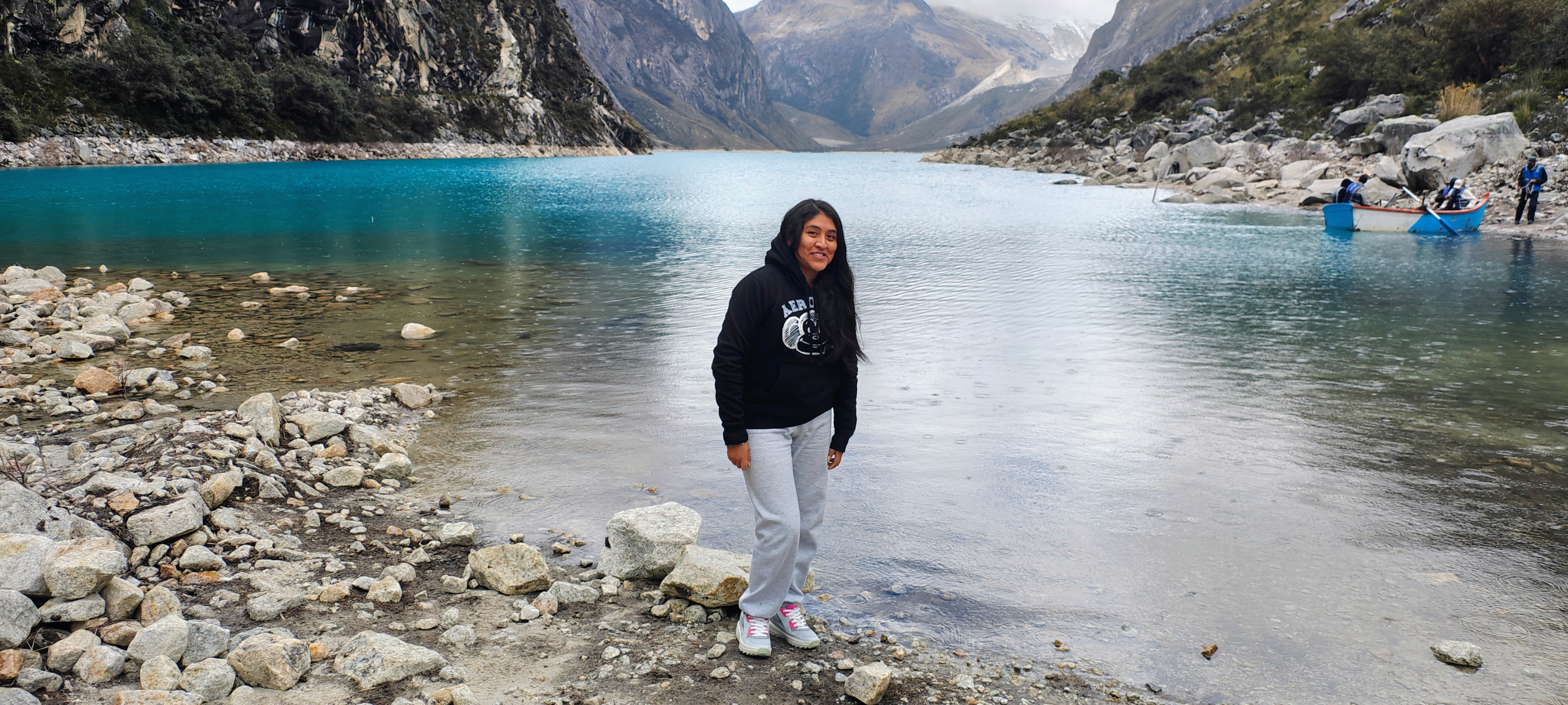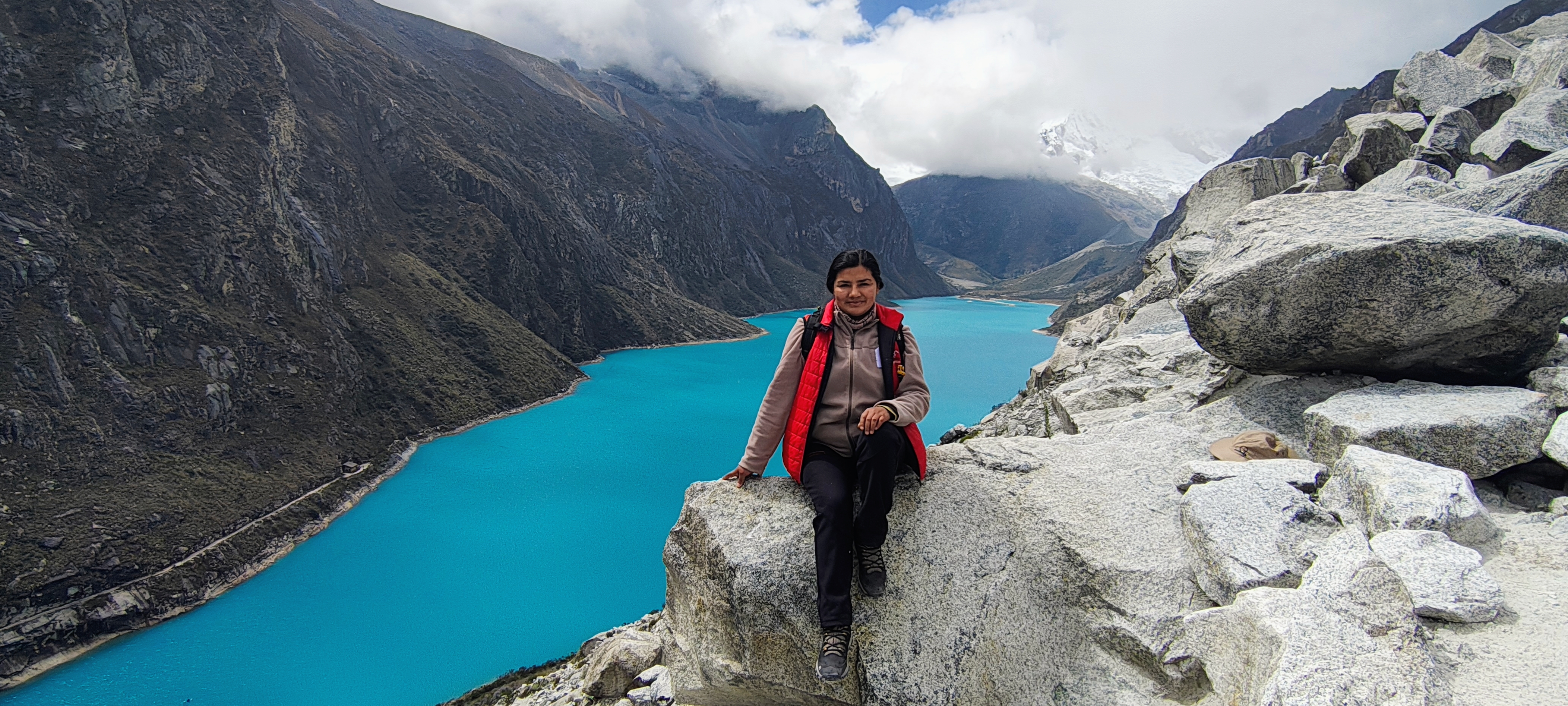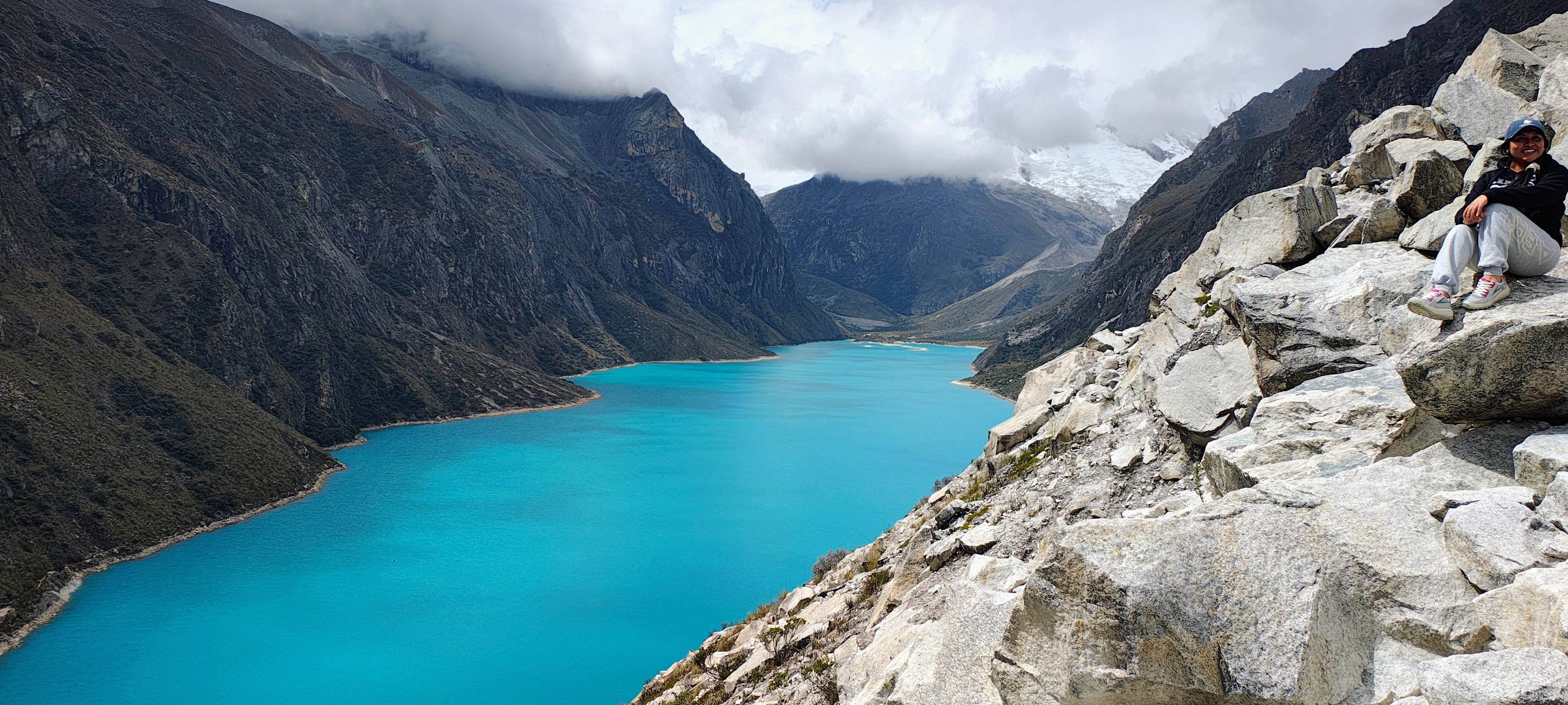 Y allí estaba la laguna toda para mí, asentada de millones de años de hielo perforando la roca para luego morir en agua en el lecho redondeado de turquesa, a 4 600 metros de altura buscando el cielo que se afana en nubes, llanto de la montaña por la muerte de los tres muchachos peruanos en el Artesonraju, mientras el viento intentaba mecer el pañuelo que me cubría la cabeza, ¡ Maese Viento!