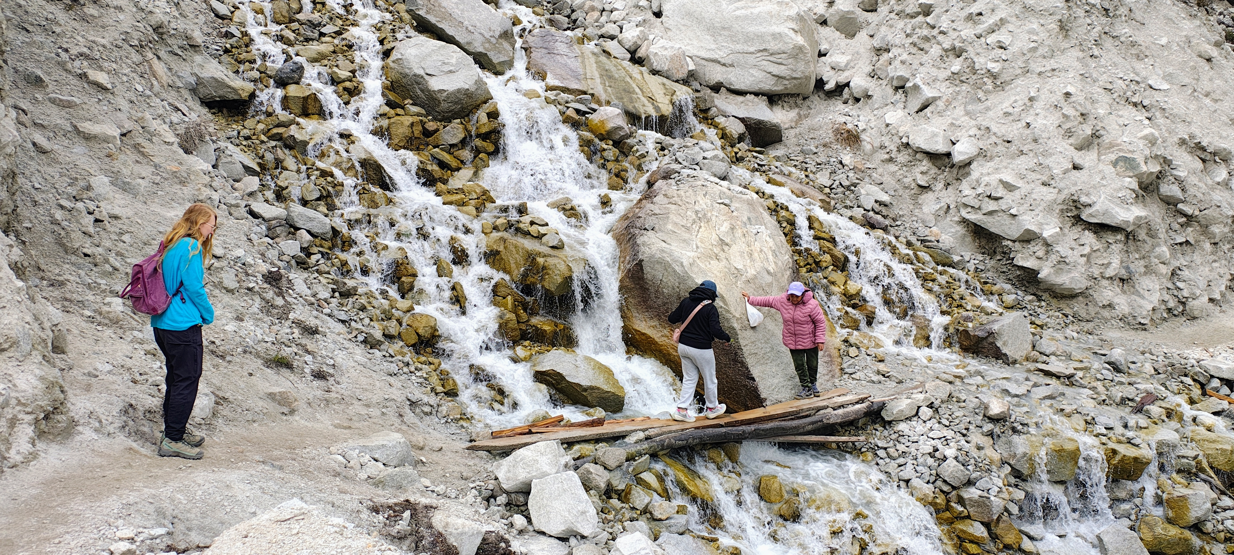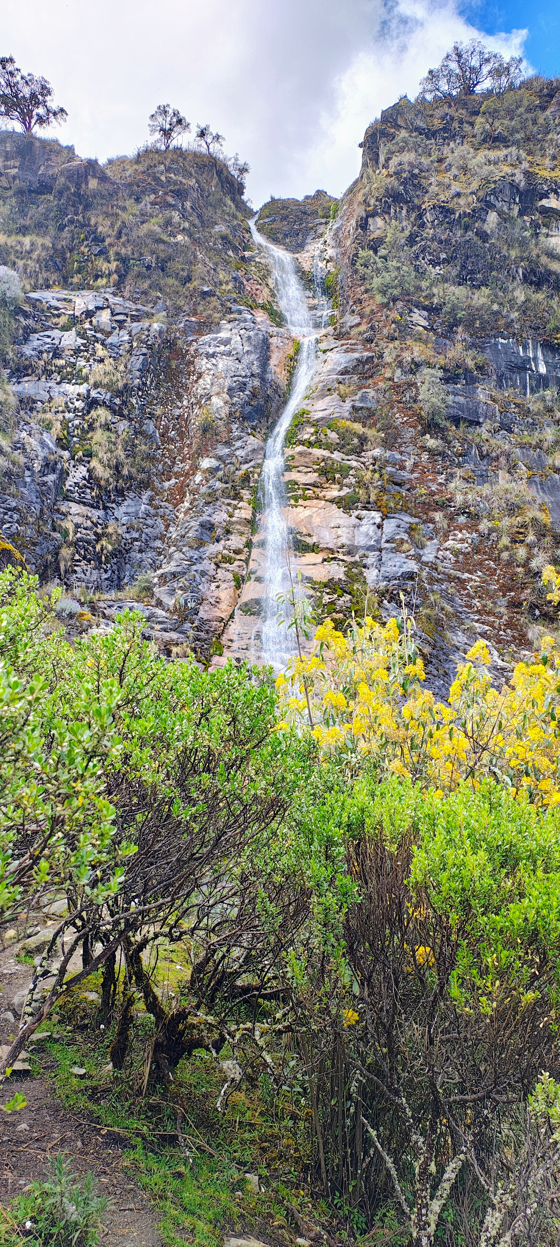 Vamos subiendo la pendiente que cuesta como buena cuesta a más de cuatro mil metros, el guía Daniel, aparece de repente , viene sudoroso y parece que le va a dar un infarto, pero nos insiste en que no nos paremos , que no podremos llegar a ver la laguna. Me acabo de encontrar a Anastasia, la israelí de ayer, le hago alguna foto en la ascensión junto a las cascadas.