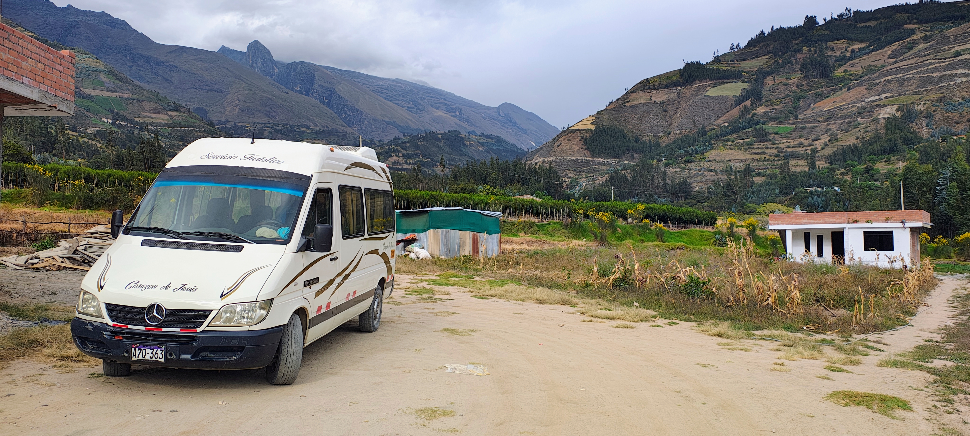Y allí en los soportales estaba Gina, me recogió el primero y me subí a una furgoneta con los parabrisas bastante rotos, luego comenzó a dar vueltas por todo Huaraz, sin orden ni concierto, según le sonaba el teléfono a Gina iba a recoger un cliente, y de esta guisa durante una hora dimos vueltas hasta subirse a la furgoneta, tres chinos, dos brasileños, dos peruanas de Lima, una israelí y finalmente una pareja de alemanes que les hice de traductor al inglés pues Gina contaba casi todo en castellano.