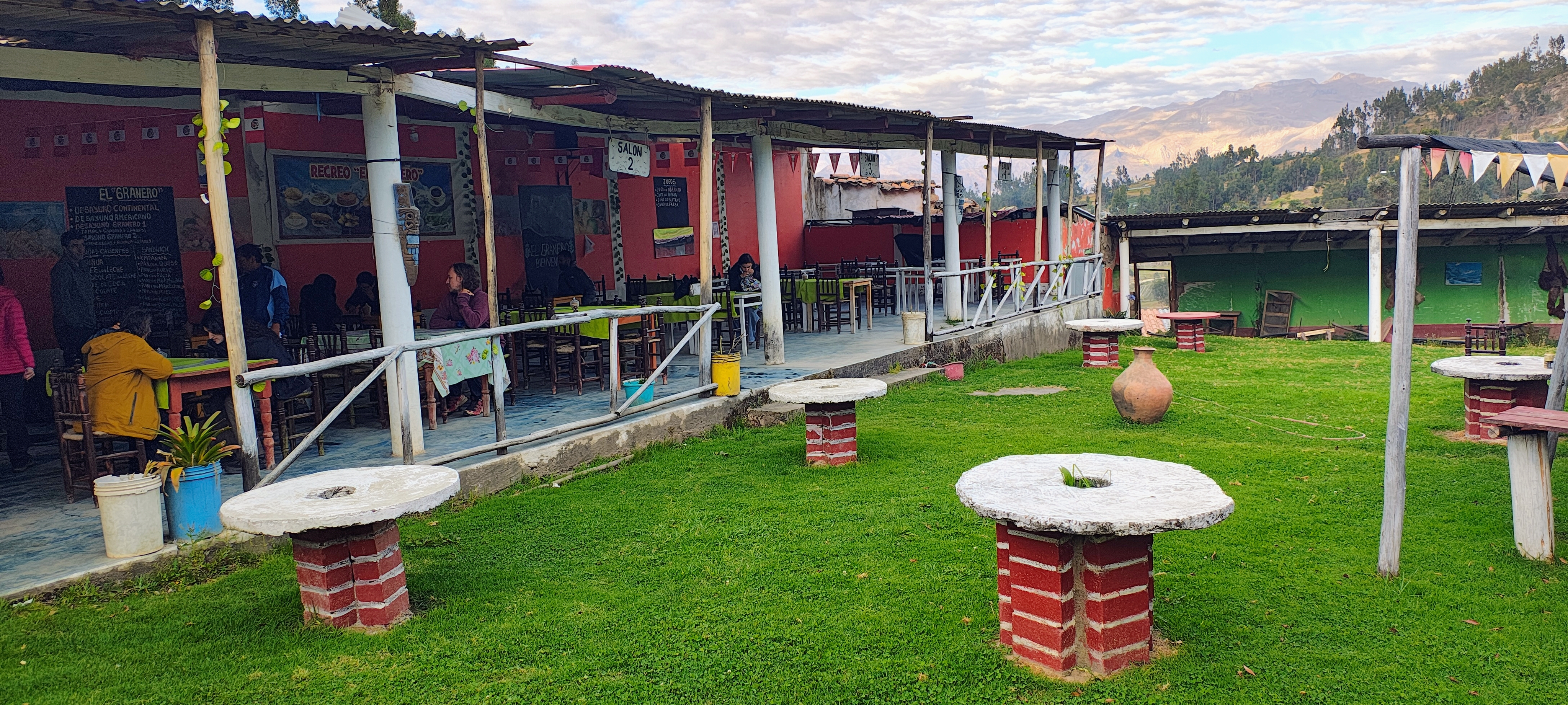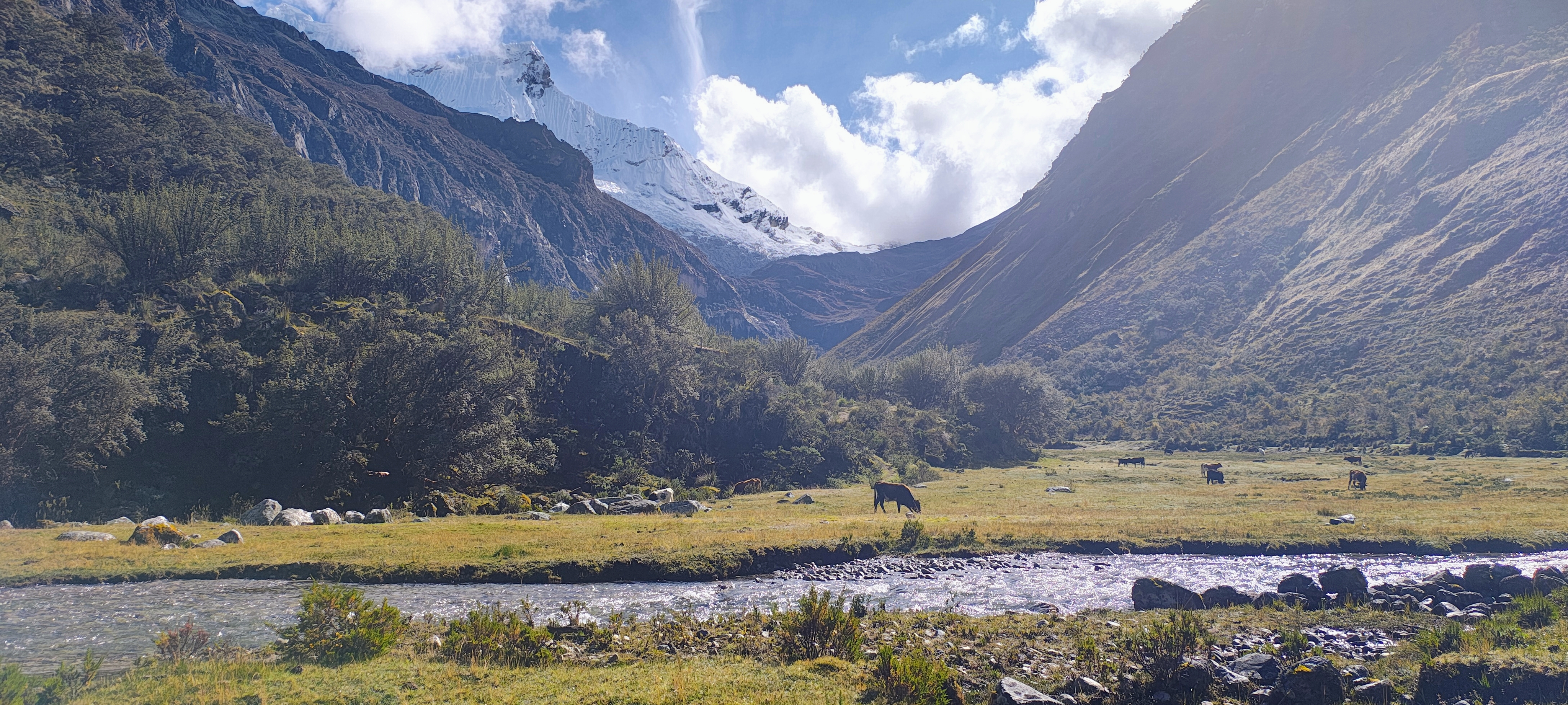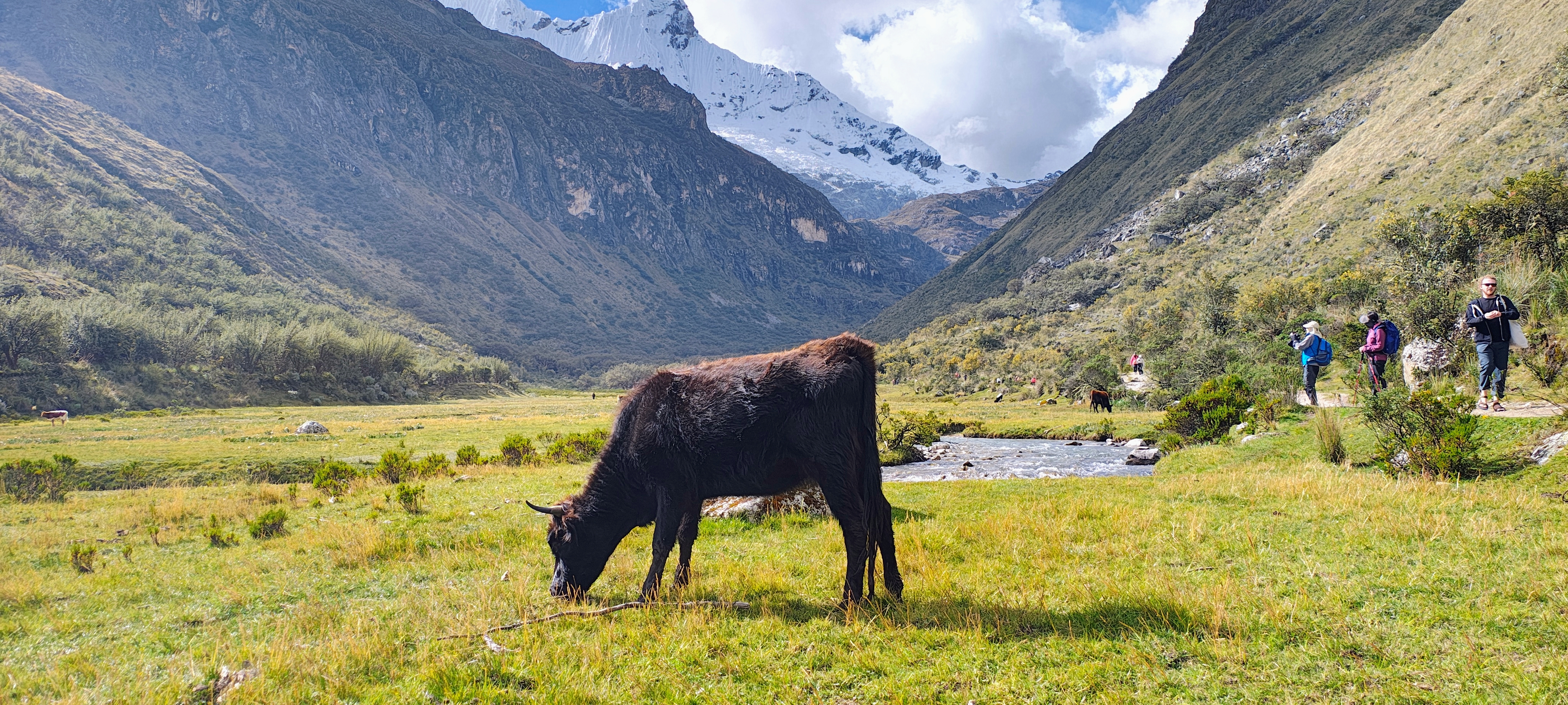 En 500 metros estamos en la zona de los restaurantes del parque, previamente nos habían cobrado 30 soles en el autobús por entrar en el parque nacional de Huascarán, no nos detuvimos, nos esperaba un valle muy tumbado lleno de vacas, más propio de Suiza que de Perú, que dejábamos a nuestras espaldas el Huascarán Sur con sus nieves blanqueando los azules celestiales.