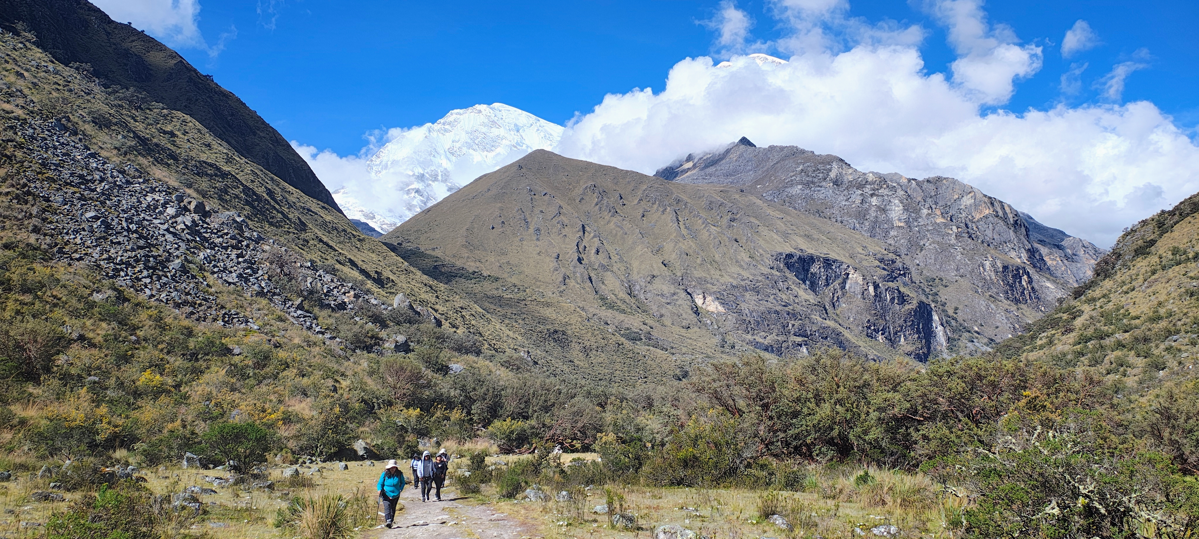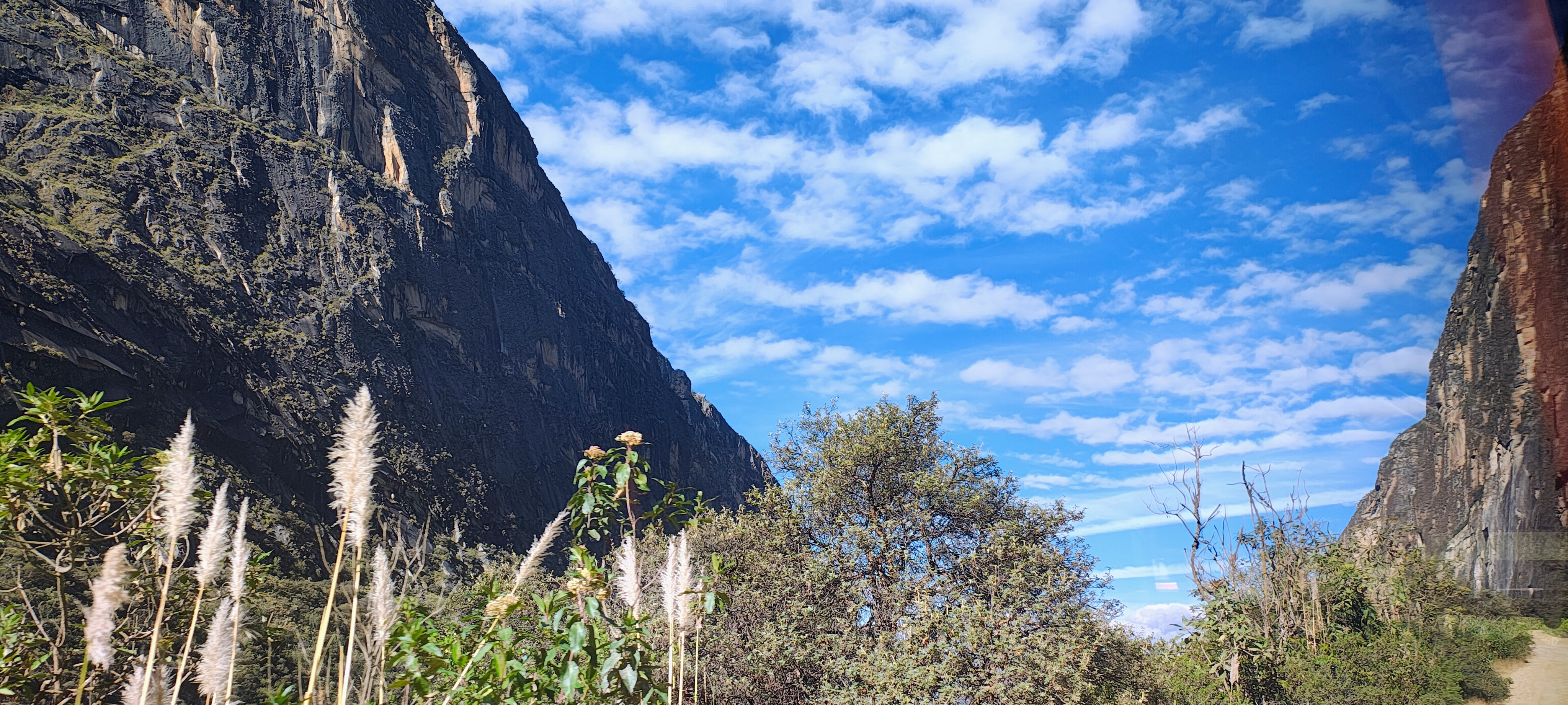Y los 100 Km de distancia hacia el norte lo hicimos en cuatro horas de viaje, nos encaminamos por el valle del rio Santa o Hatun Mayu que recorre de Norte a Sur el departamento de Áncash, Gina nos contó entre muchas cosas que la Cordillera Negra se encontraba al oeste del valle y la Cordillera Blanca al este, la cordillera negra también tenía cimas de cinco mil metros pero sin nieve, y era muy importante su presencia porque al cortar los vientos cálidos del océano pacífico permitían que la Cordillera Blanca tuviera un microclima con nieve a partir de los cinco mil metros. Según ella la cordillera Blanca se denominaba así, no por sus nieves, sino por la blancura de los granitos que la formaban y la cordillera negra era por ser materiales volcánicos más oscuros y más antiguos.