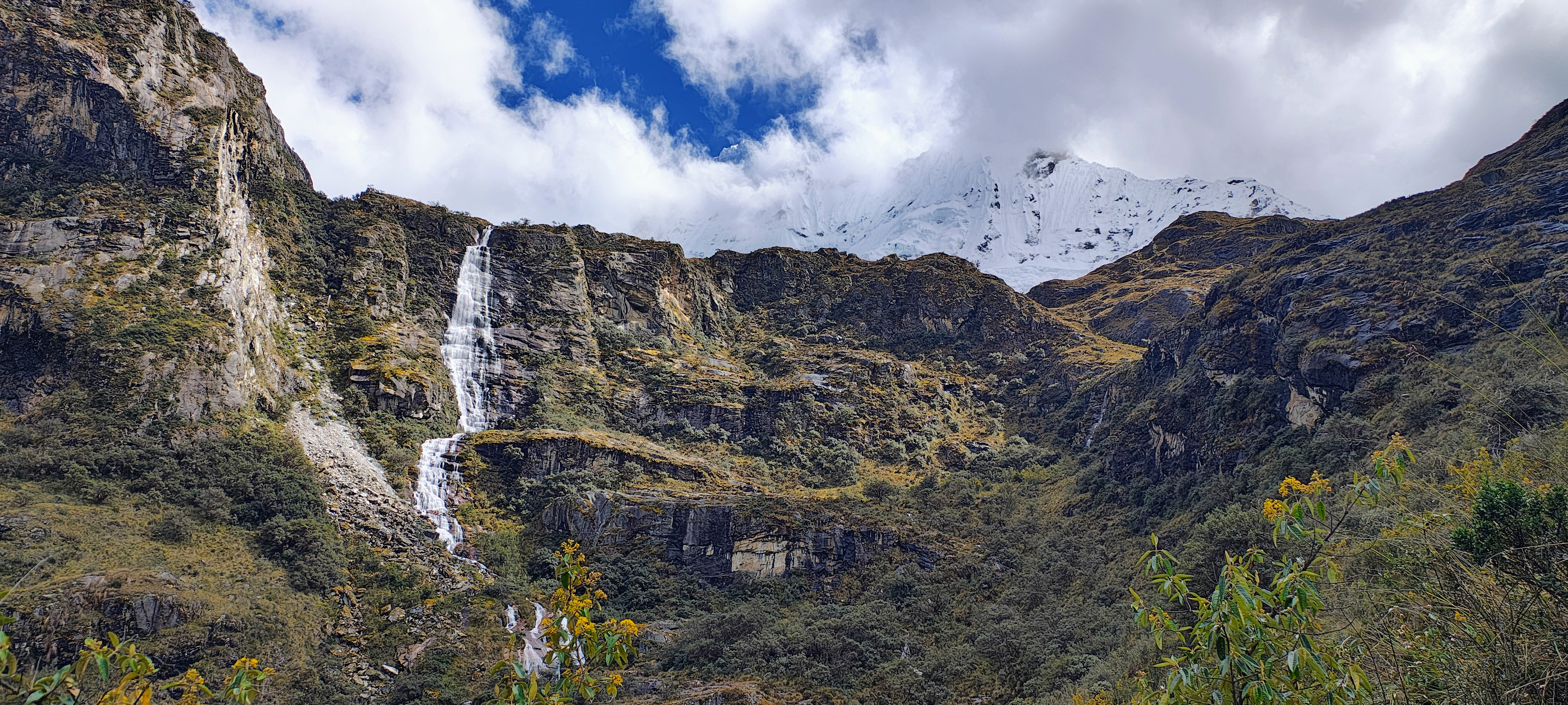 El valle empieza a encresparse en cuesta y una cascada aparece en nuestra derecha y luego otra a la izquierda, estamos subiendo una terraza más alta del valle glaciar.
