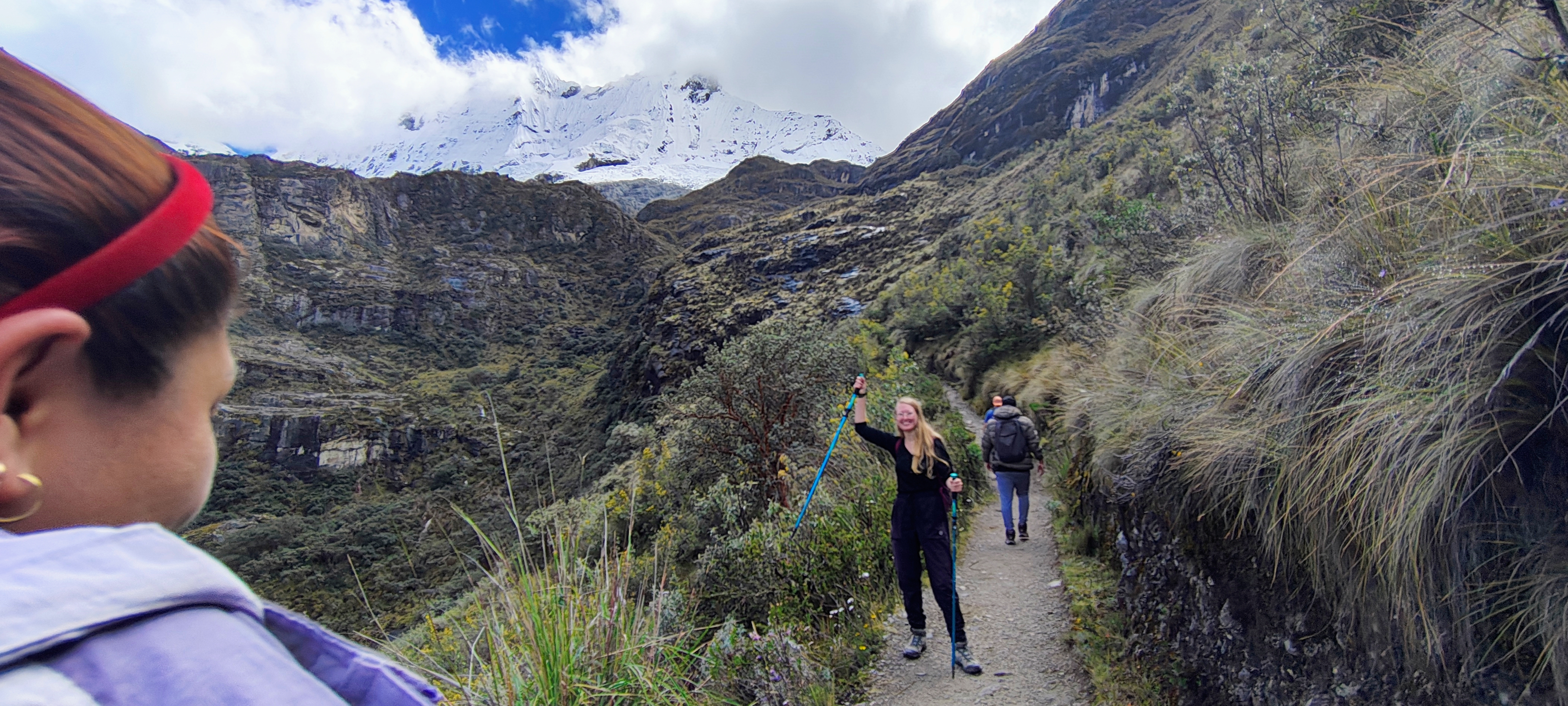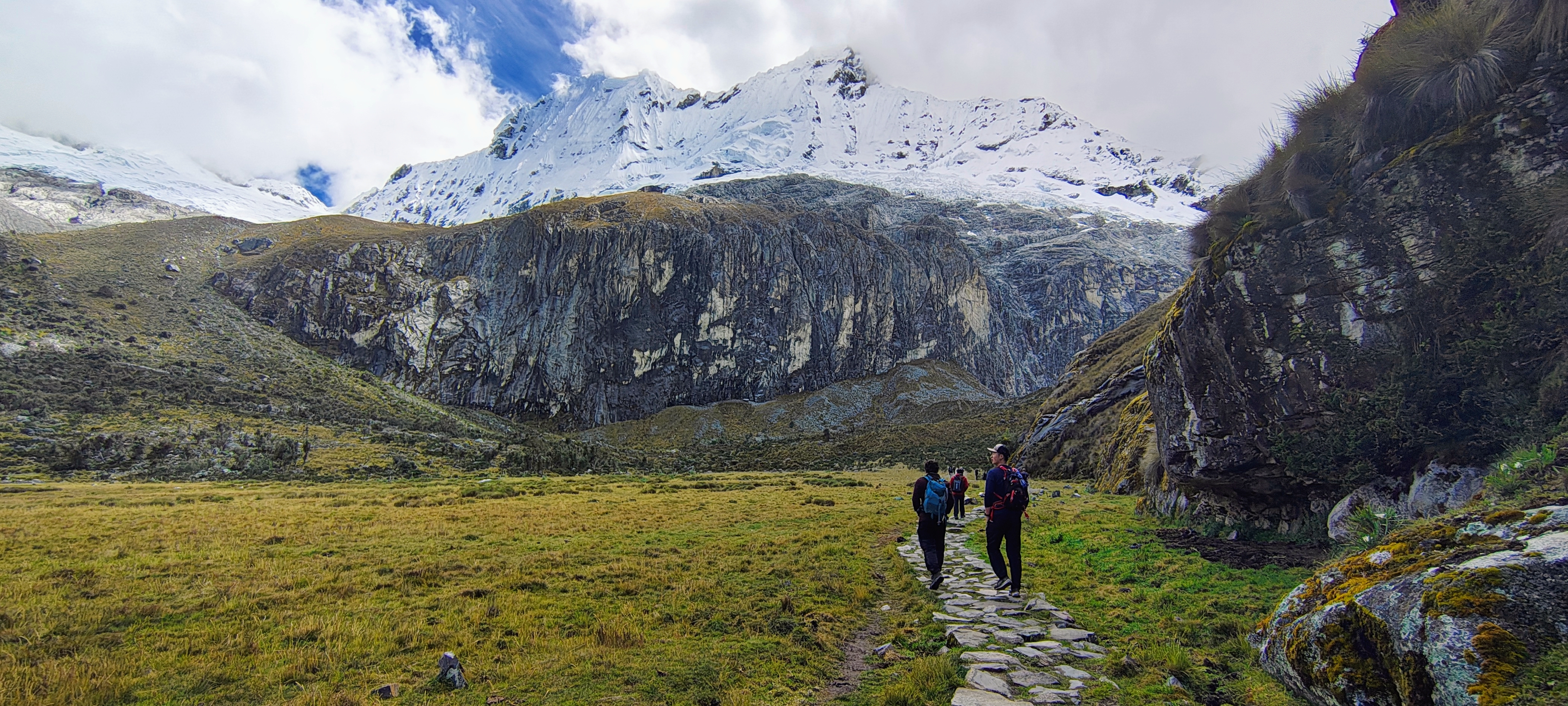 Nos dice Gina que mejor primero subamos al mirador de la laguna, hay cien metros de desnivel y desde allí se deberían de ver las grandes cumbres, entre ellas el Artesonraju que es la montaña que sale al principio de las películas de la Paramount .
