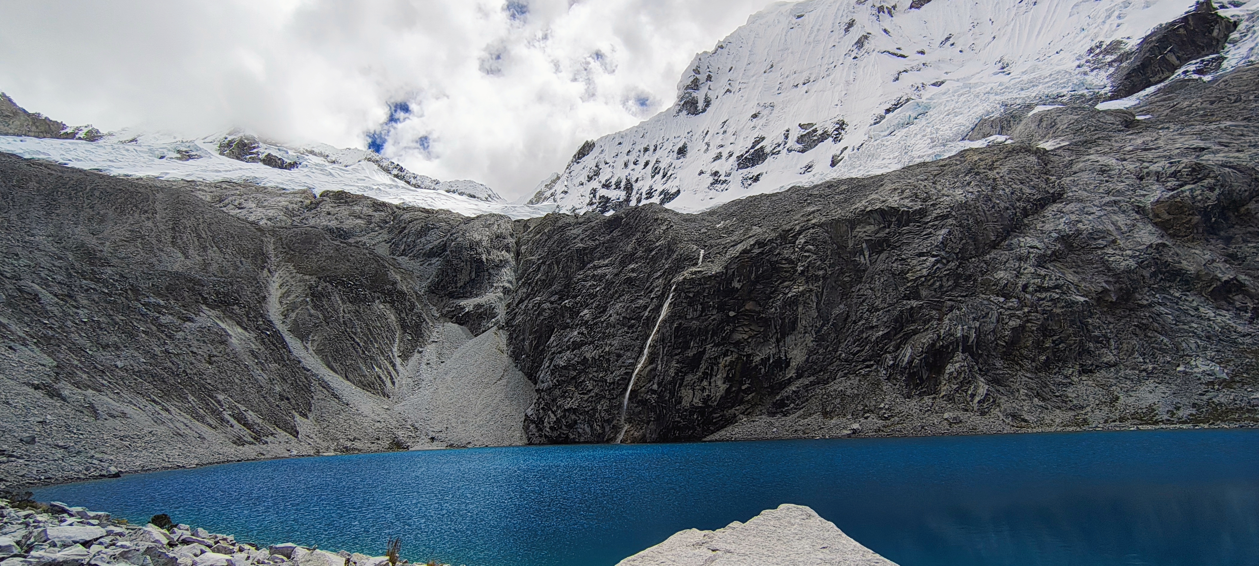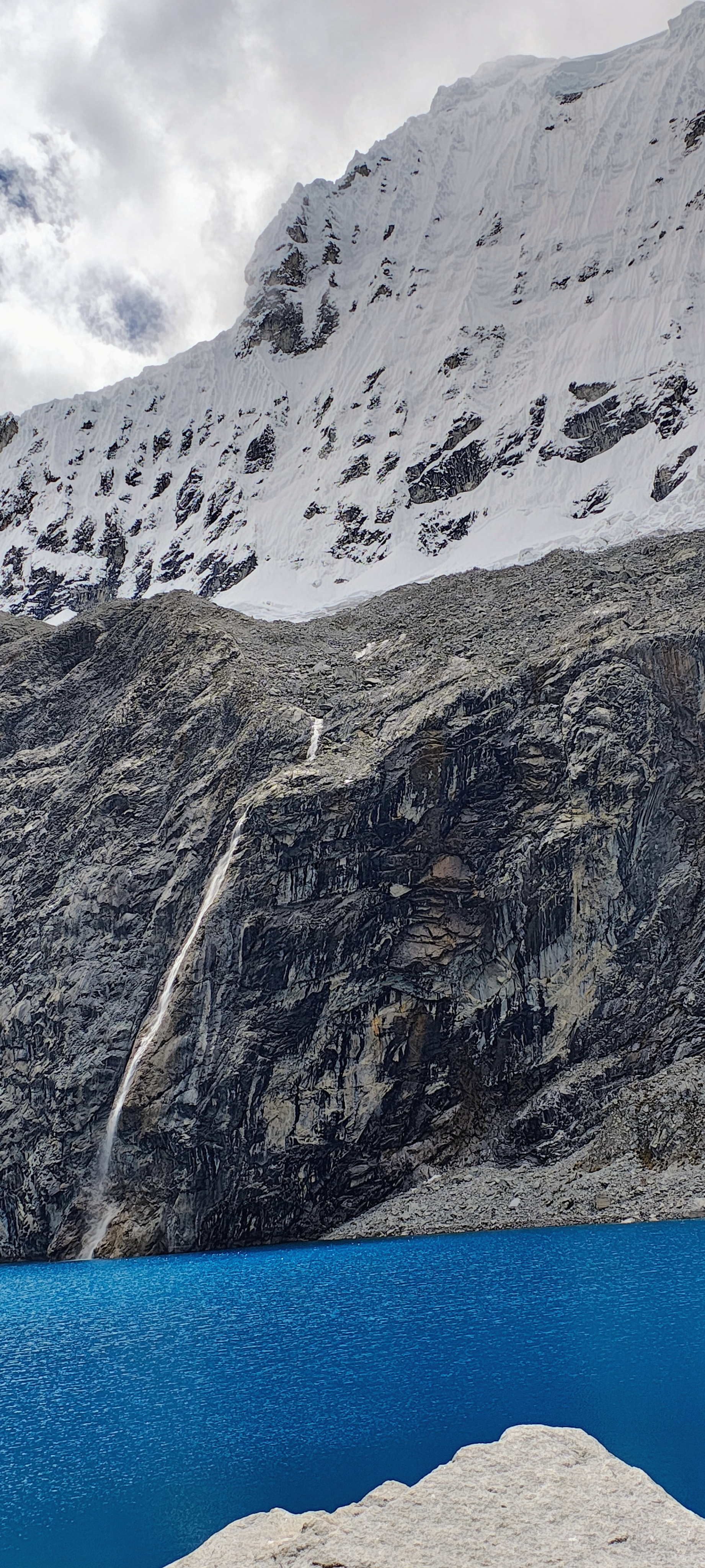 Me sitúo sobre una gran roca, para ver mejor, no solo ver, también escuchar, oler, y sobre todo sentir, la cascada se precipita por la pared vertical cubierta de nieve, las aguas turquesa se embelesan de cielo y nubes que lamen las cumbres que apenas se dejan ver…