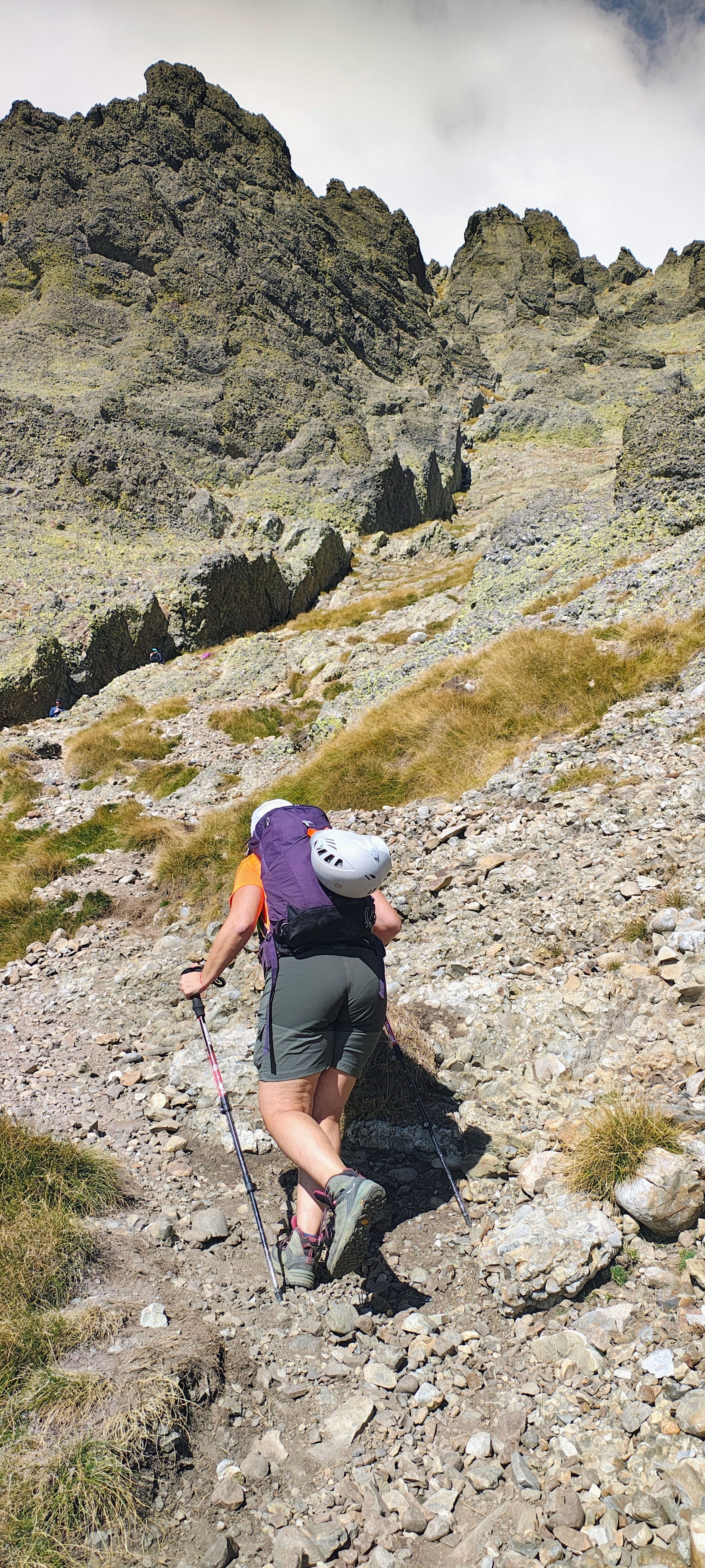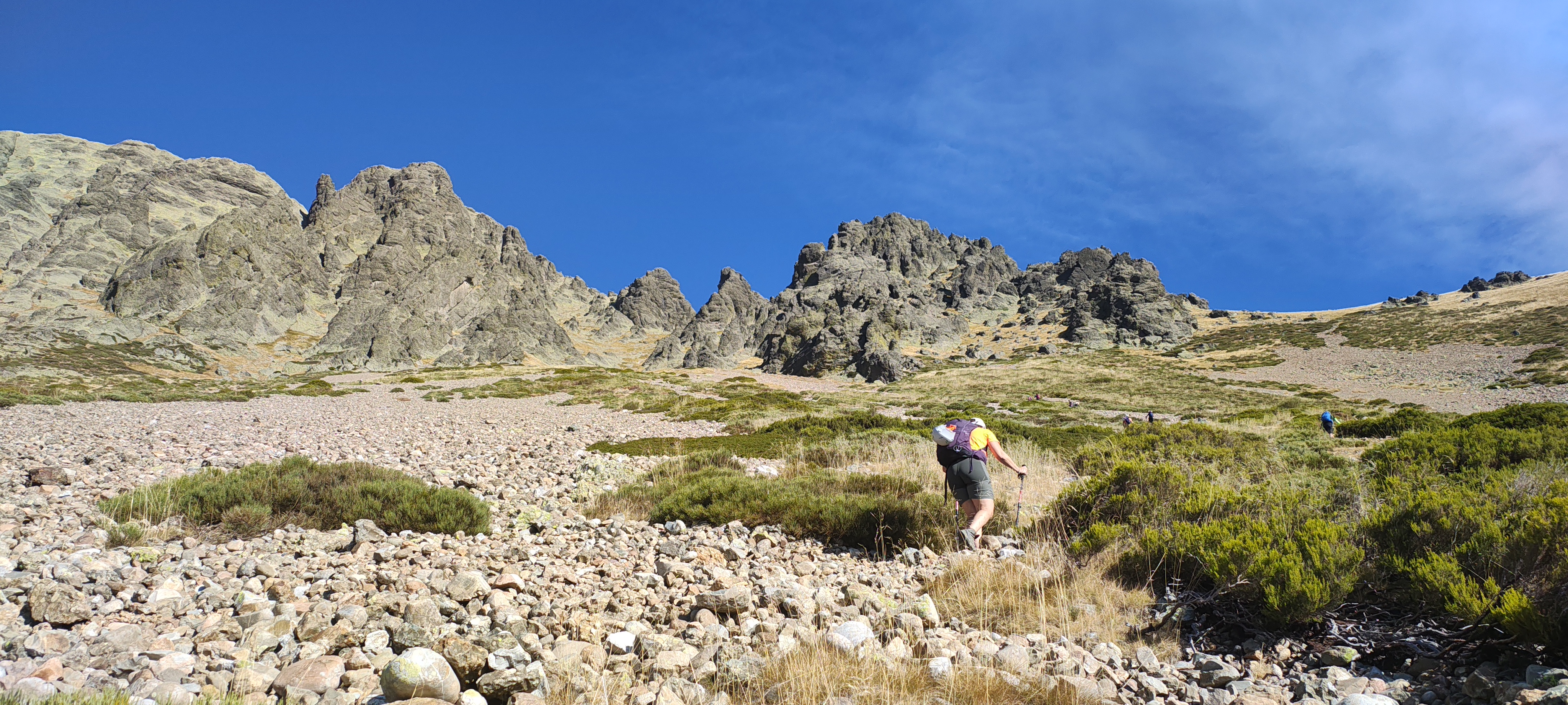 Hay que extremar las precauciones estamos en zona de caída de piedras, nos hemos puesto los cascos y hay un surco entra las rocas, es una ruta muy frecuentada pero para ser domingo de puente tampoco hay demasiada gente.