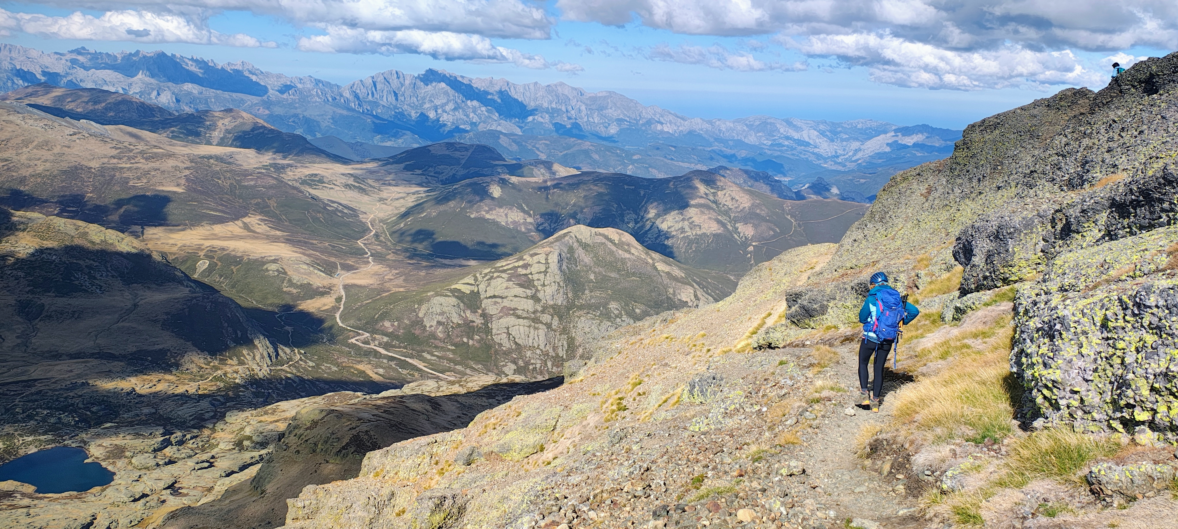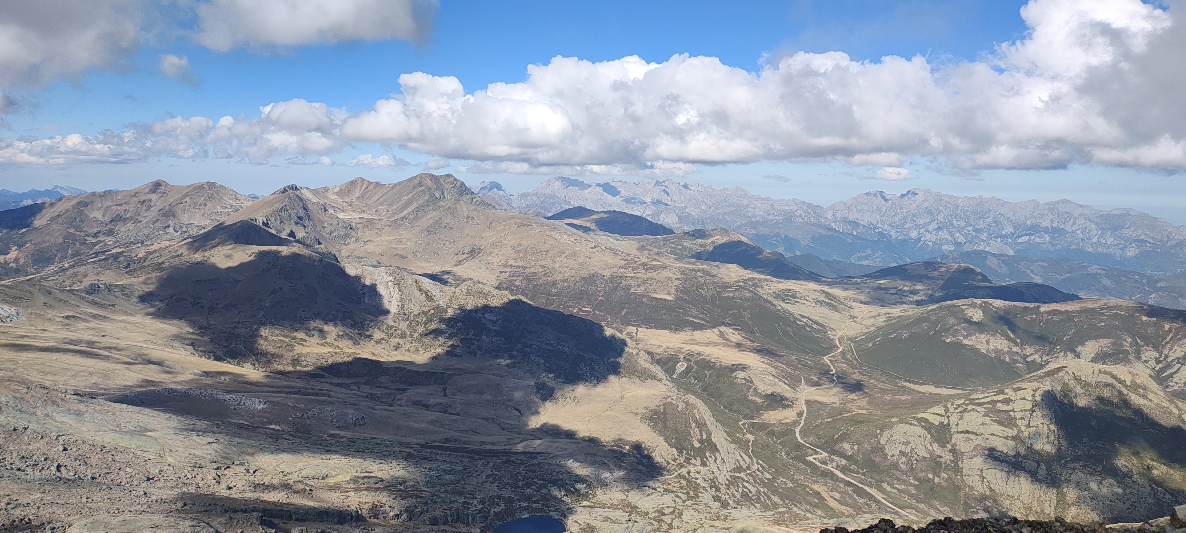 Salimos con prisa, bajamos hacia la cuerda mirando los Picos de Europa de fondo, la siguiente cumbre está lejísimos así que decidimos bajar, tratando de llegar a la pista.