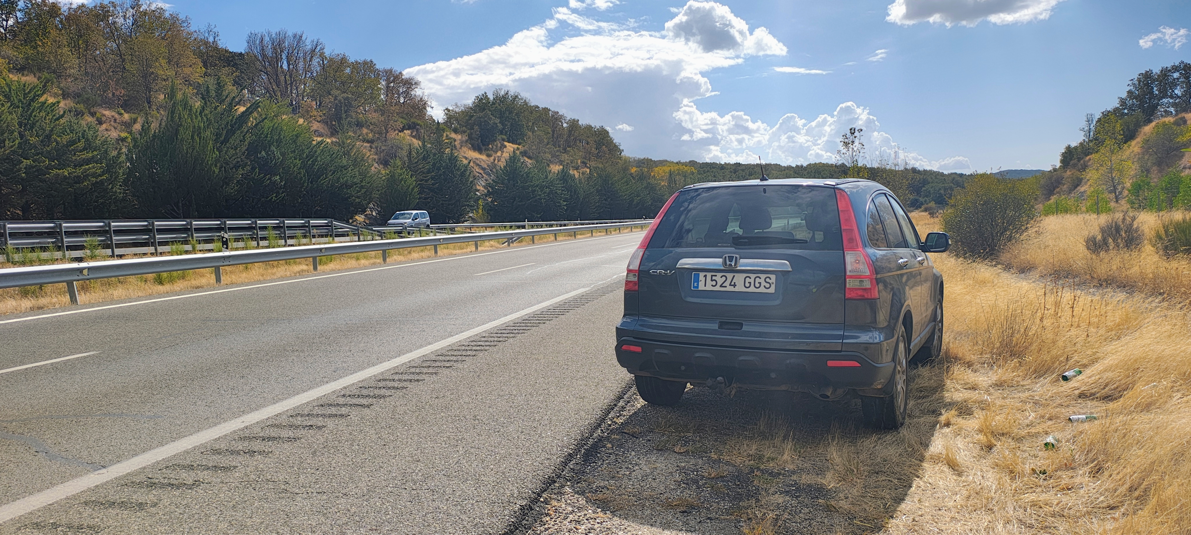 Al minuto pasa un guardia civil de tráfico en moto, me hace señales pero no para, detrás viene otro guardia civil, la pareja del primero, se baja de la moto y me ayuda a empujar el coche para sacarlo completamente de la calzada, me dice que si llamé a la grúa y le dije que estaba en ello, me contestó que tenía que irse que se había averiado más adelante una máquina grande, pero que al de la grúa le dijera que estaba en el Km 279 de la A-66.