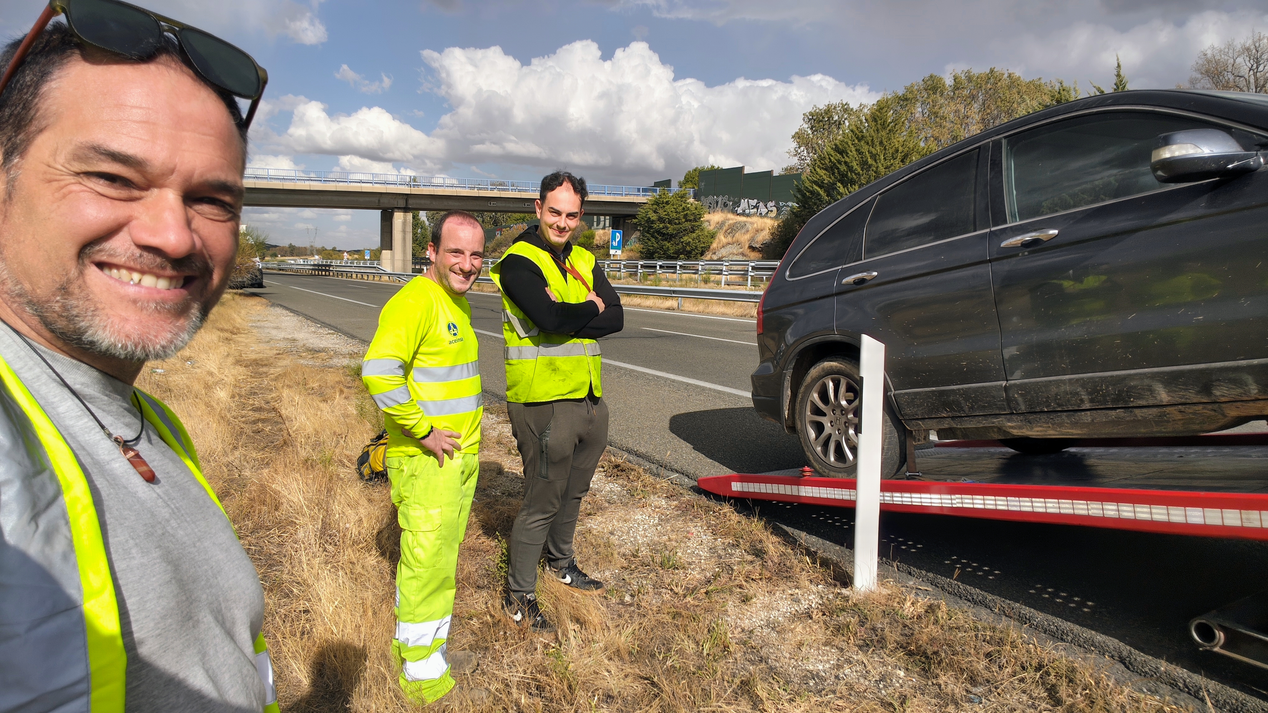 Al minuto aparece una furgoneta de mantenimiento llena de luces traseras y se coloca tras mi triángulo, el guardia civil la habría llamado al mismo tiempo que me dijo el Km de la autovía para la grúa.